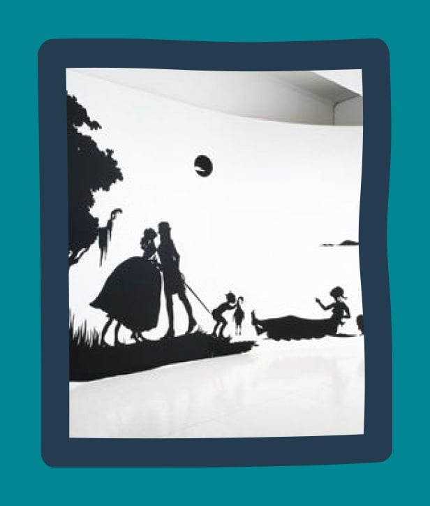 Walker’s signature style features black cut-out silhouettes on a white background, and Gone is one of the most striking examples of her work. The installation depicts scenes from the American Civil War, often with unusual or confronting themes and messages, exploring the artificial constructs of race.