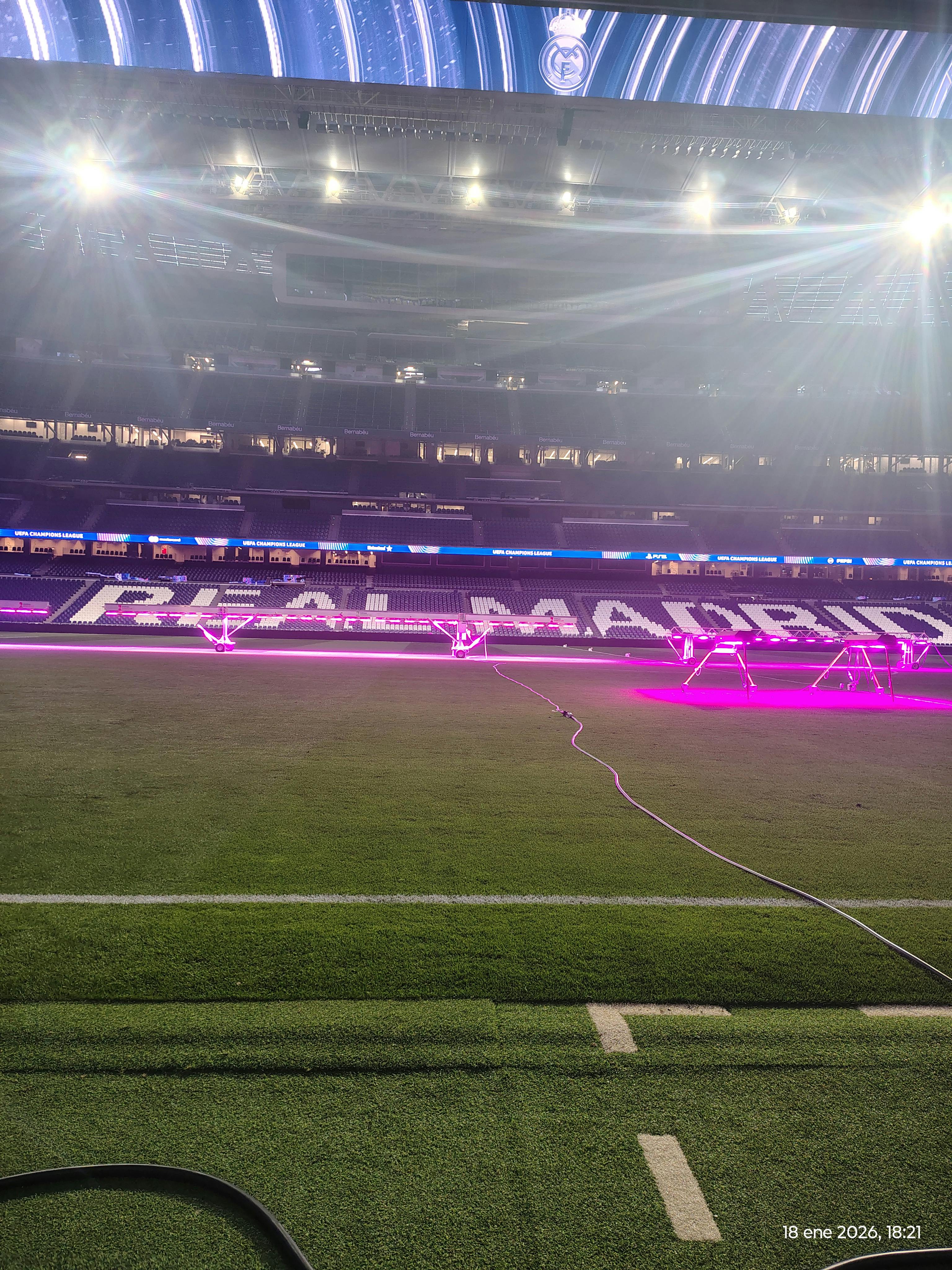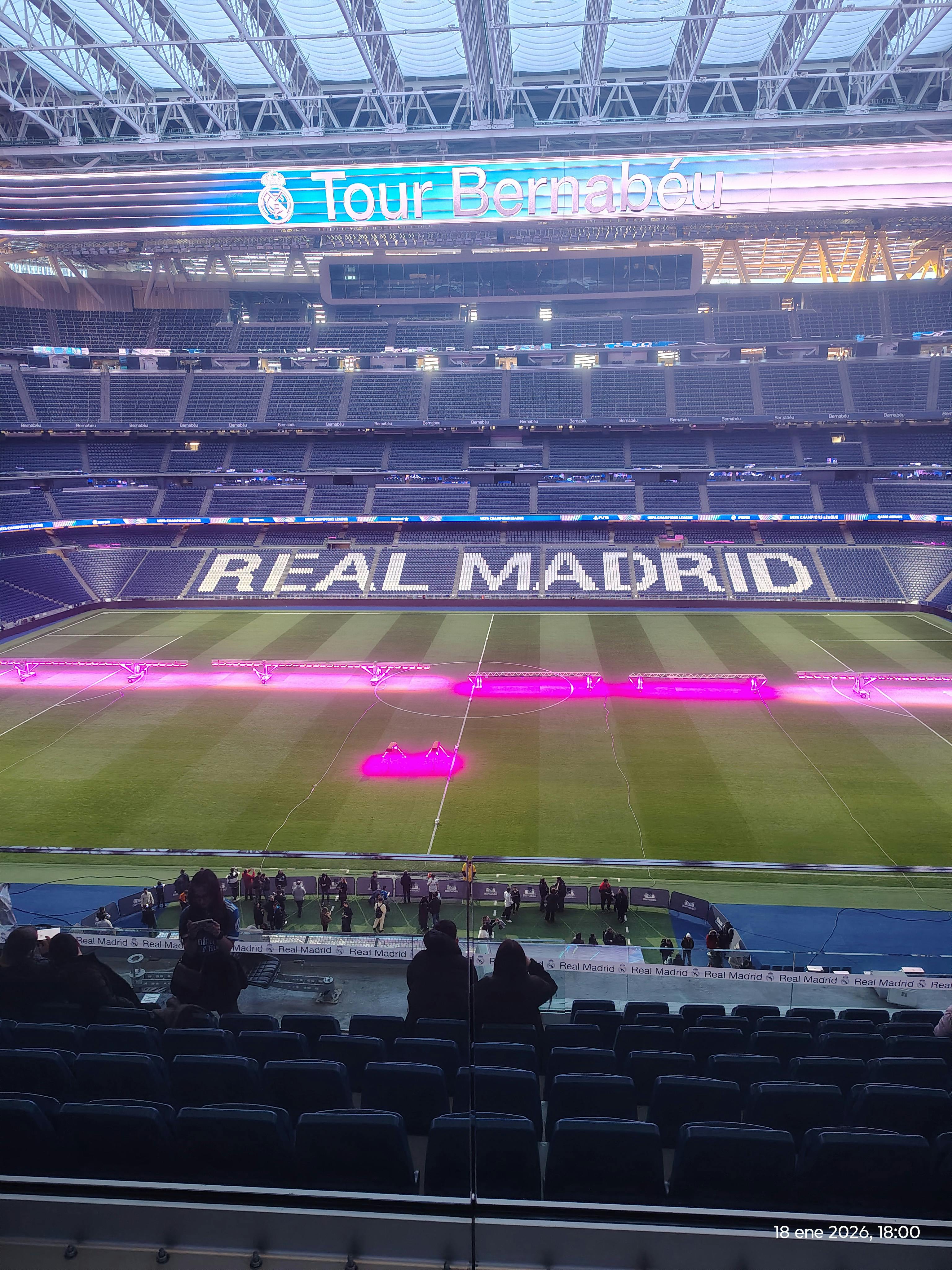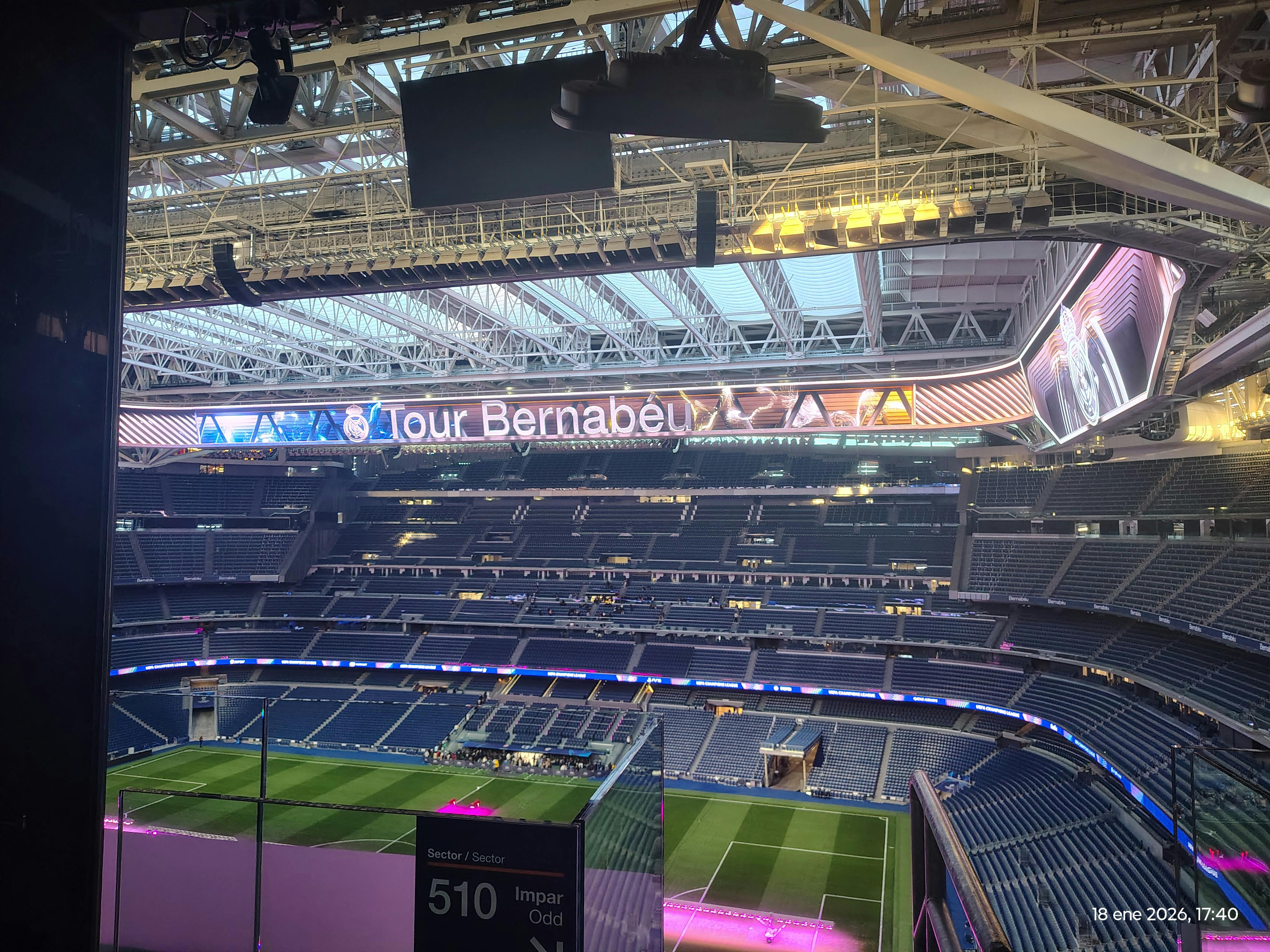 A sobre penja la nova coberta retràctil, amb la seva moderna estructura i aparells d'il·luminació. Podeu imaginar l'estadi tancat en una gran nit europea, il·luminat amb els colors del club. Des d'aquí, entens l'escala del terreny i com la remodelació l'ha transformat en un espai modern.