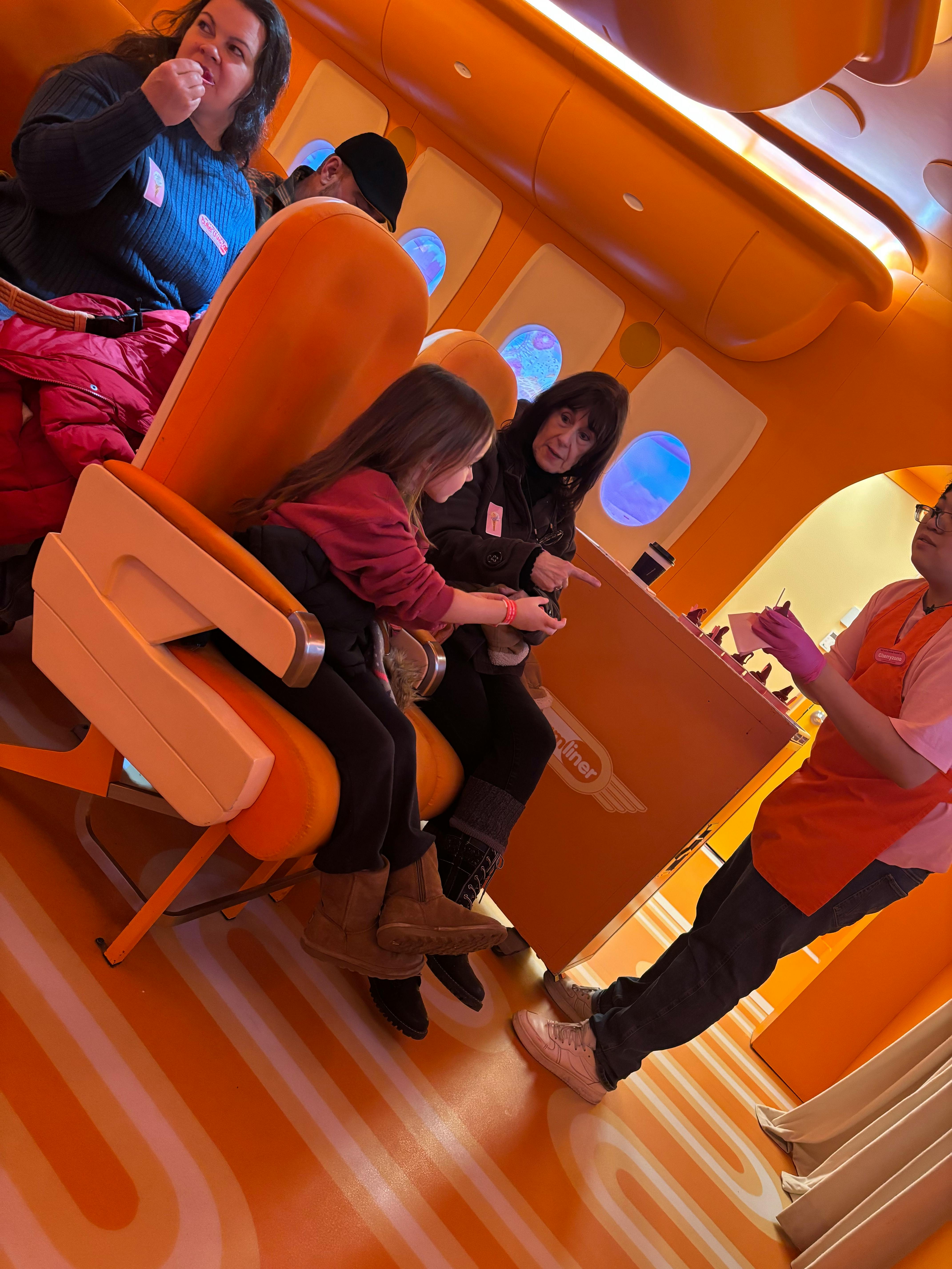 Me encantó la sección del avión el helado que probamos allí estaba delicioso, debería haber una piscina para adultos, y deberían dar helado cuando bajas por el tobogán o algodón de azúcar, hay una...
