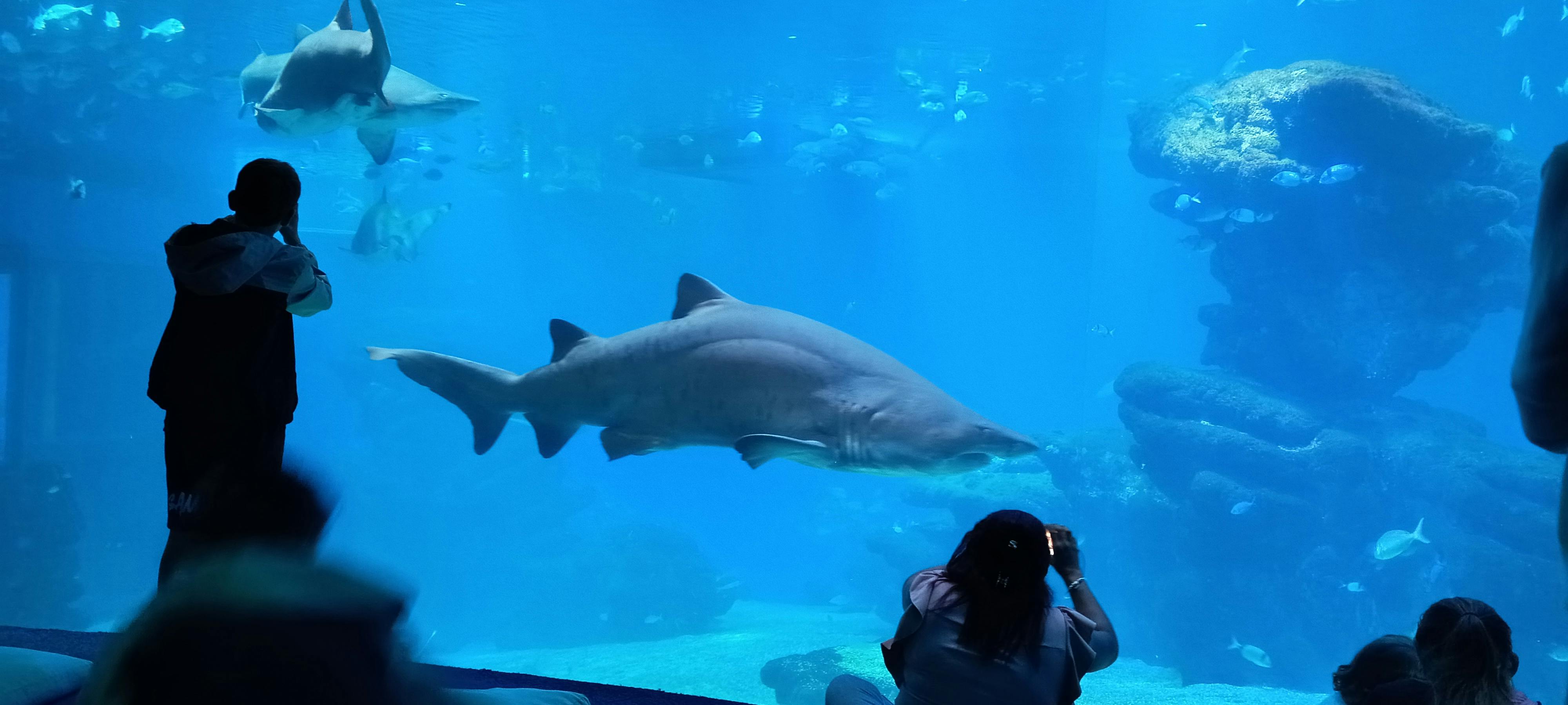 Siluetes de persones dins d'un aquari, observant taurons i peixos a través de grans finestrals submarins.
