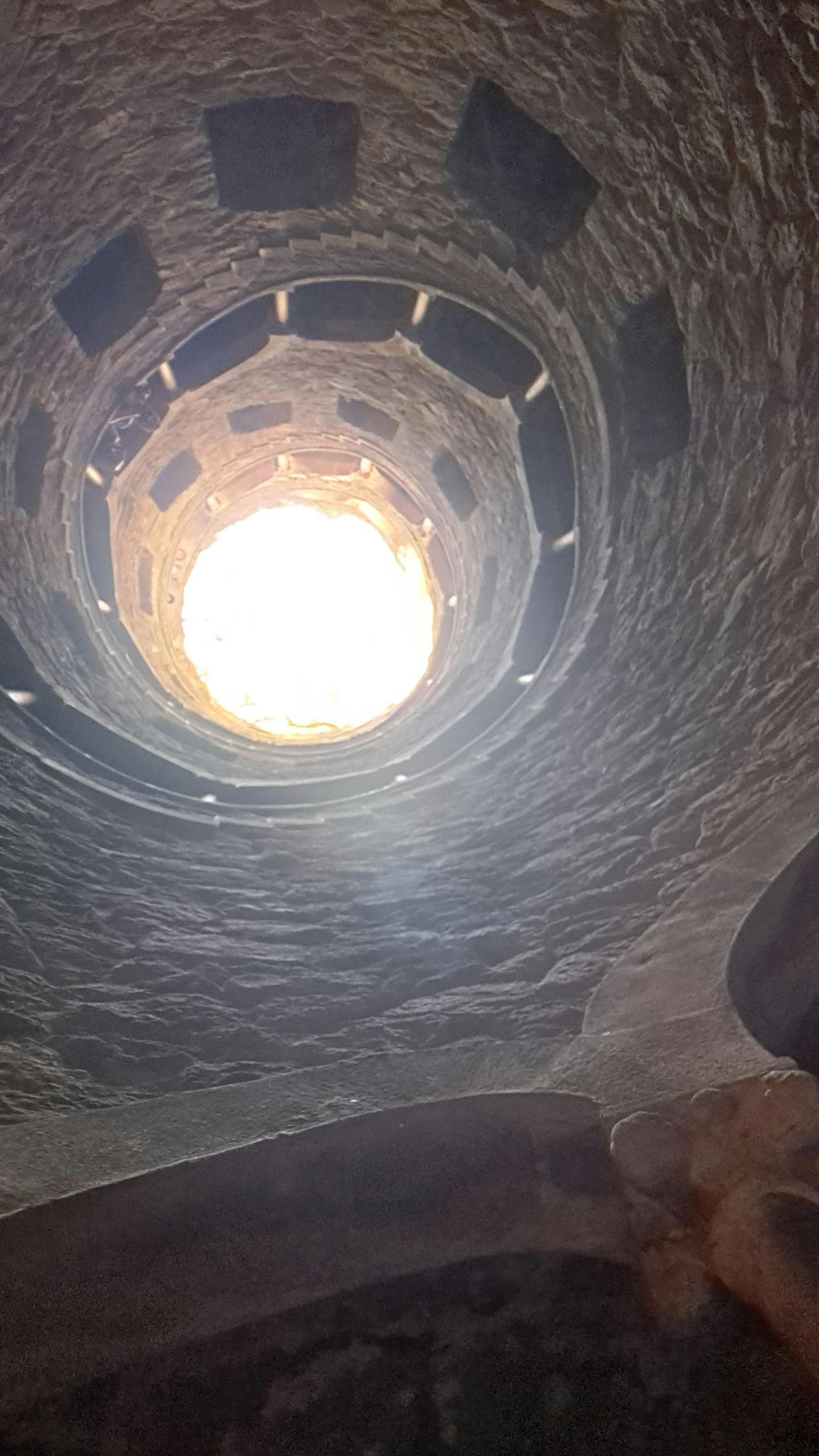 Una escala de pedra en espiral coberta de musgo baixa a un pou circular, amb arcs i columnes que recobreixen les parets.