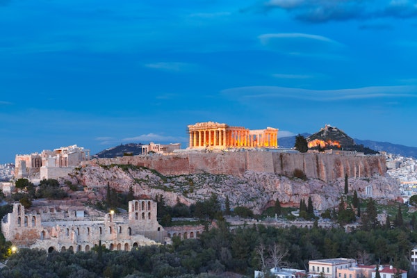 Proti večerní obloze se rozzáří aténská Akropole a Parthenón. Navštiv památky, jako je řecký parlament, Národní knihovna a muzeum Akropole osvětlené v noci.