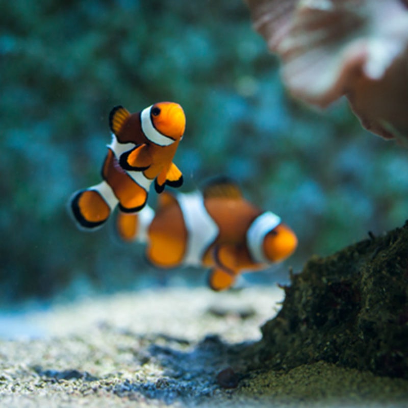 Dva klauni s oranžovými a bílými pruhy plavou poblíž mořského dna v podmořském prostředí.