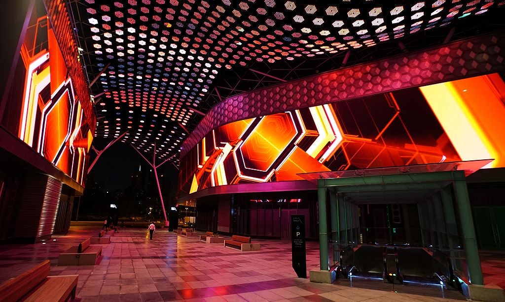 Udendørs plaza om natten, oplyst af levende geometriske lysdisplays på bygninger, med en tagbaldakin af sekskantede lys.
