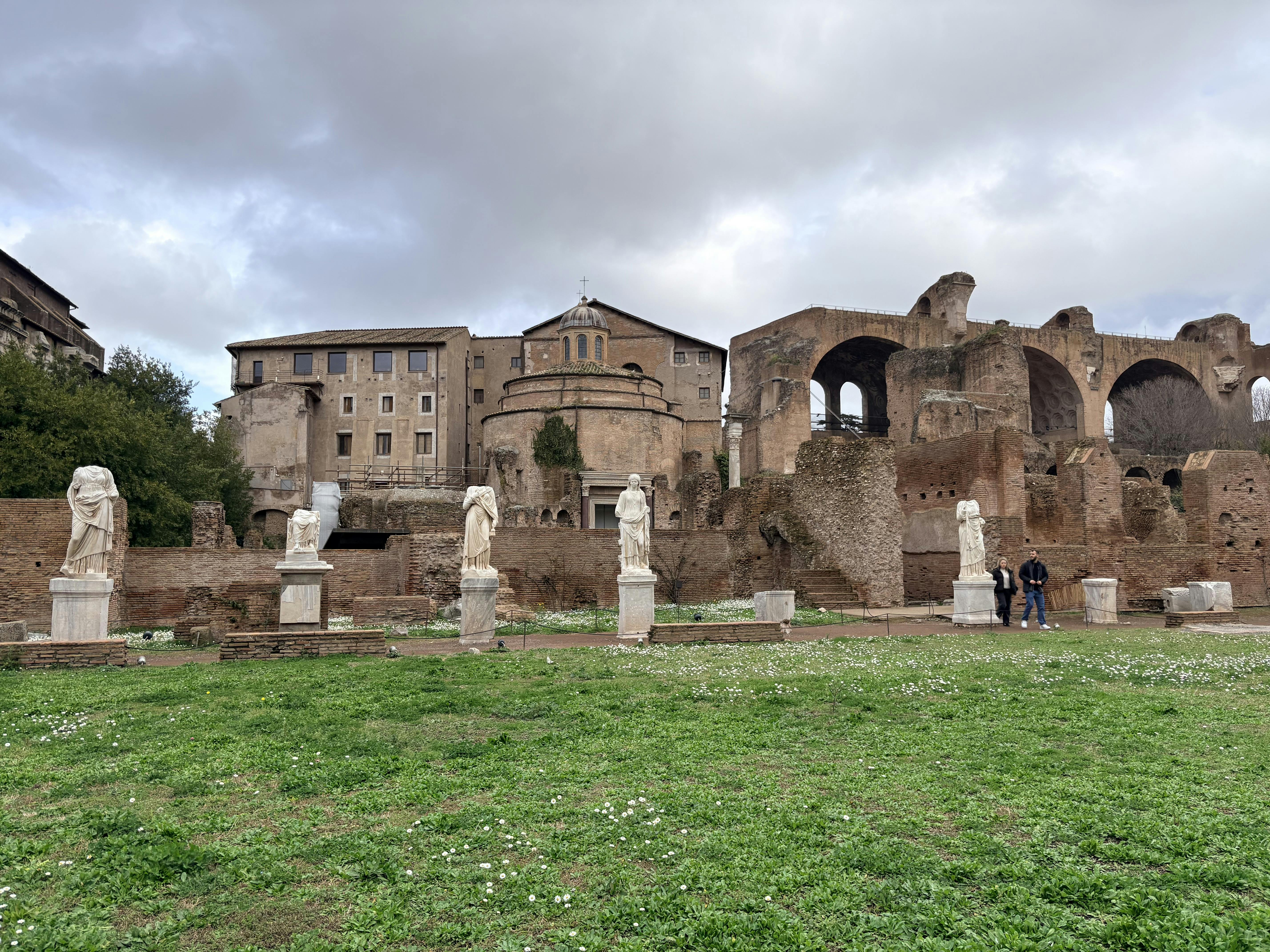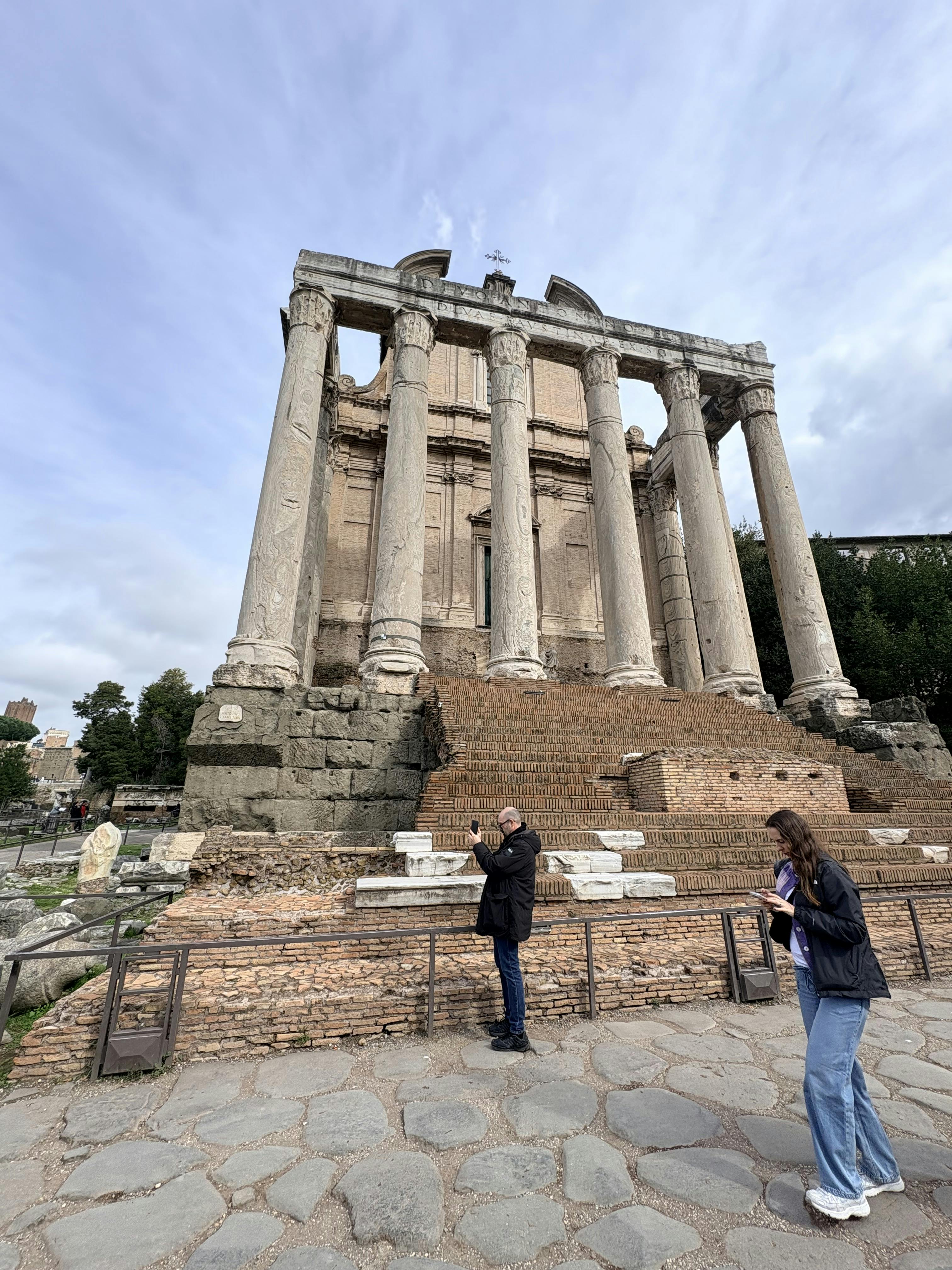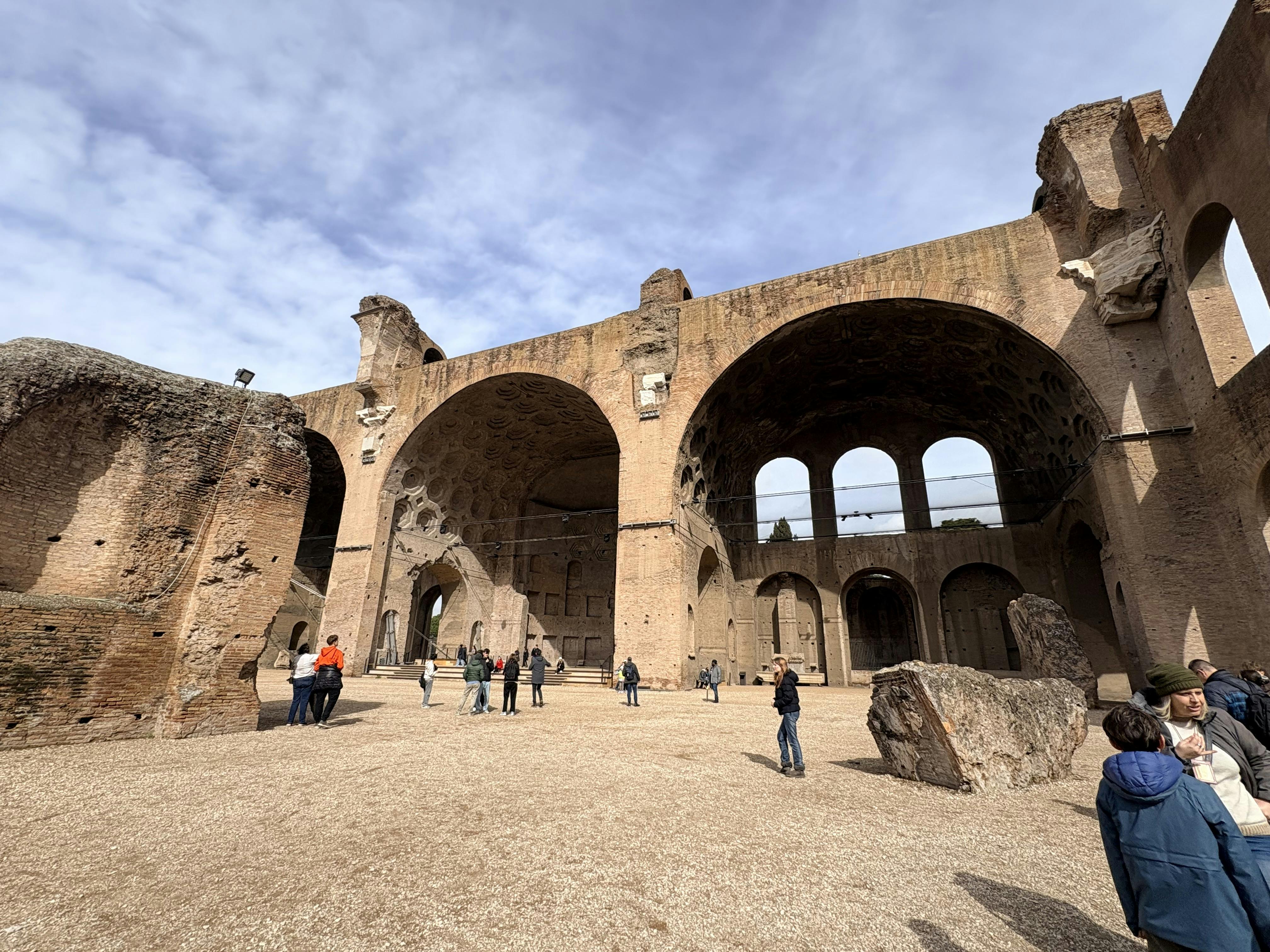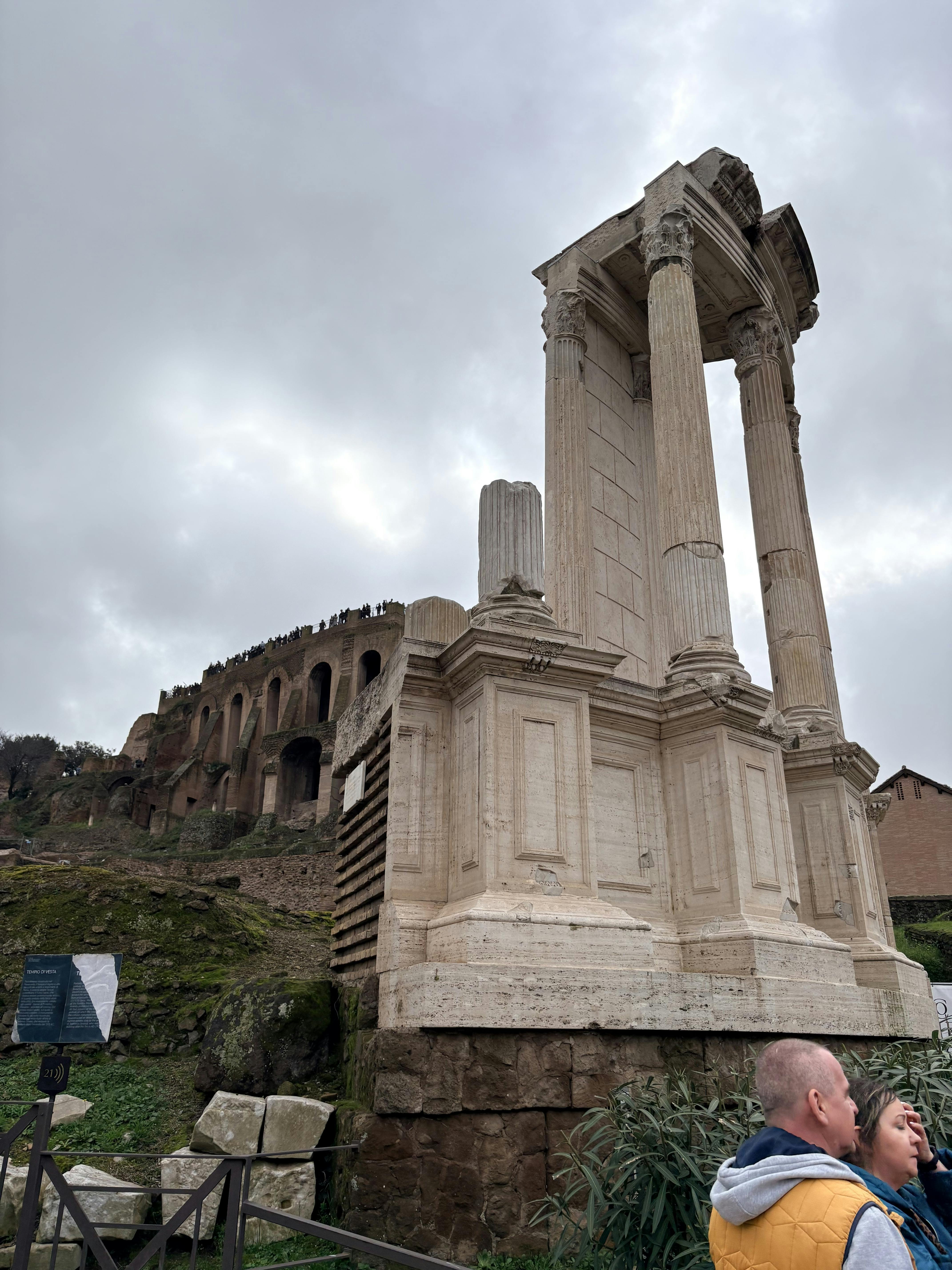 Du kan stadig se store vartegn undervejs, herunder Titusbuen, Cæsars tempel, rækker af overlevende tempelsøjler og Curia (senatsbygningen), hvor vigtige beslutninger formede imperiet.
