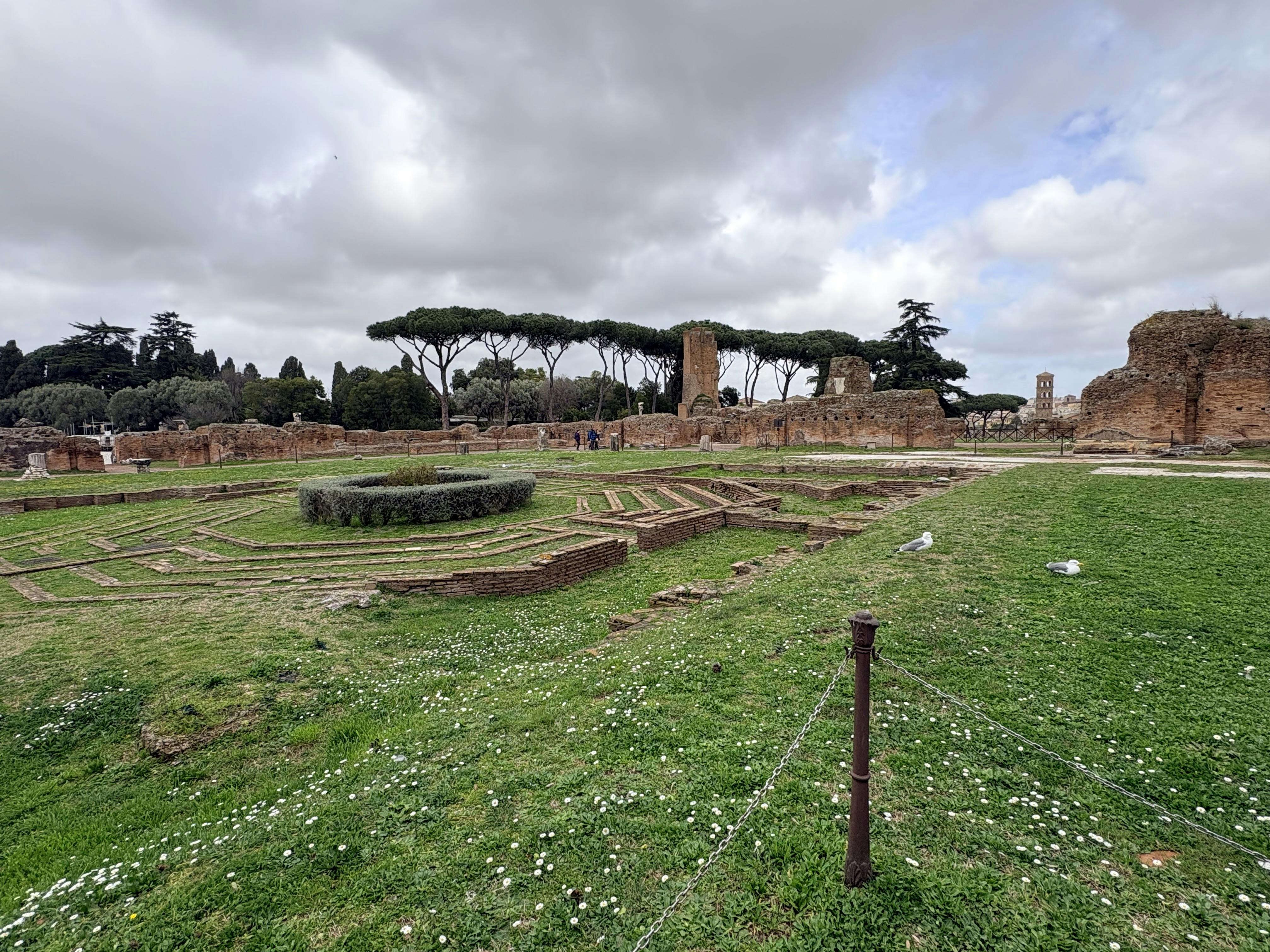 Du kan udforske de store paladsruiner, herunder Domus Flavia og Domus Augustana, og spore gårde, haller og terrasseindretninger. Fra bakketoppen får du en bred udsigt over Forum Romanum på den ene side og Circus Maximus på den anden, hvilket hjælper dig med at forstå, hvordan disse steder passer sammen.