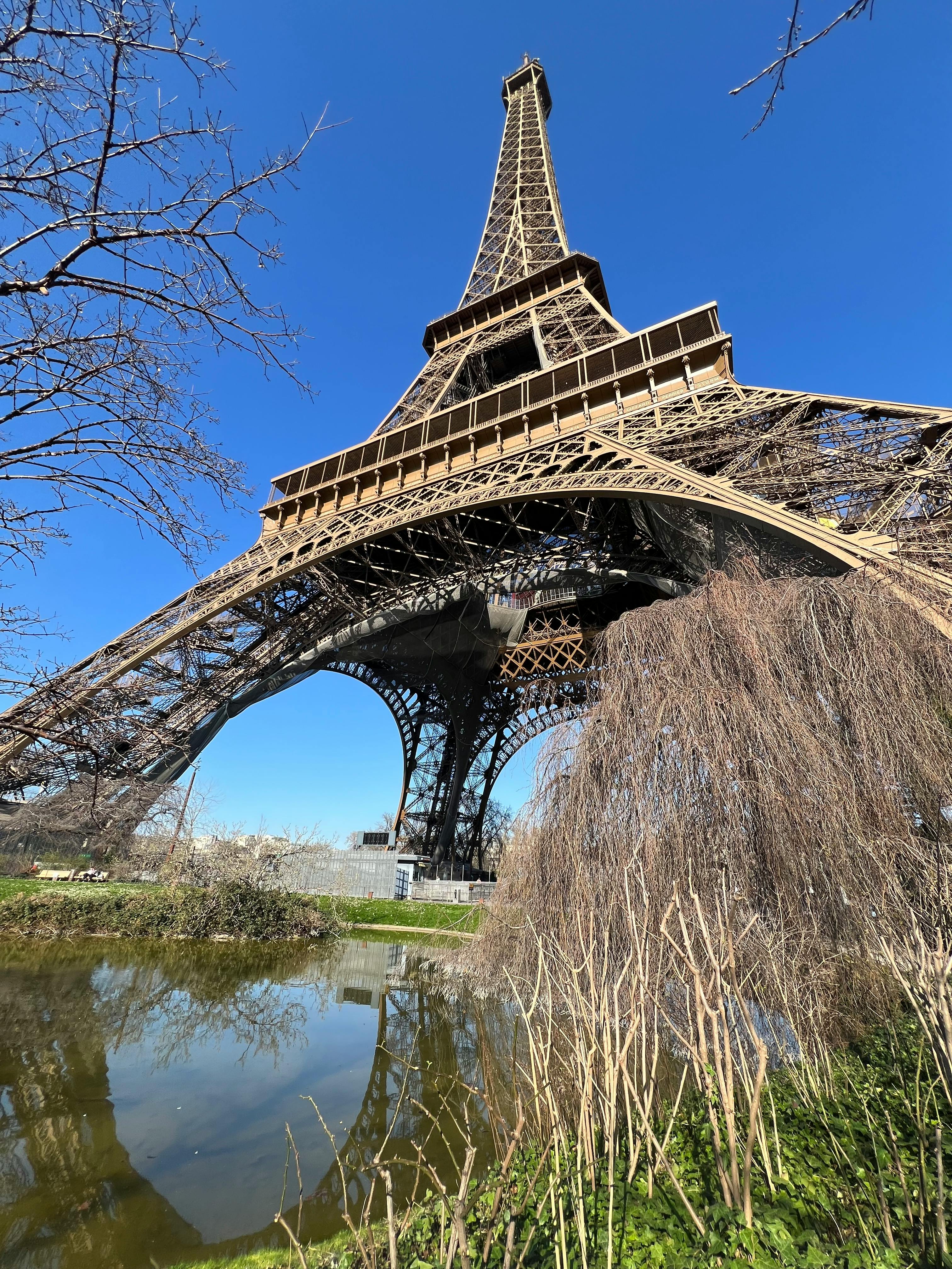 Her kan du stirre lige op gennem det indviklede gitterværk og få en fornemmelse af, hvor stort tårnet er. Gå gennem de anlagte haver i Champs de Mars, se gadekunstnere, og kig efter Gustave Eiffels buste nær den nordlige søjle.