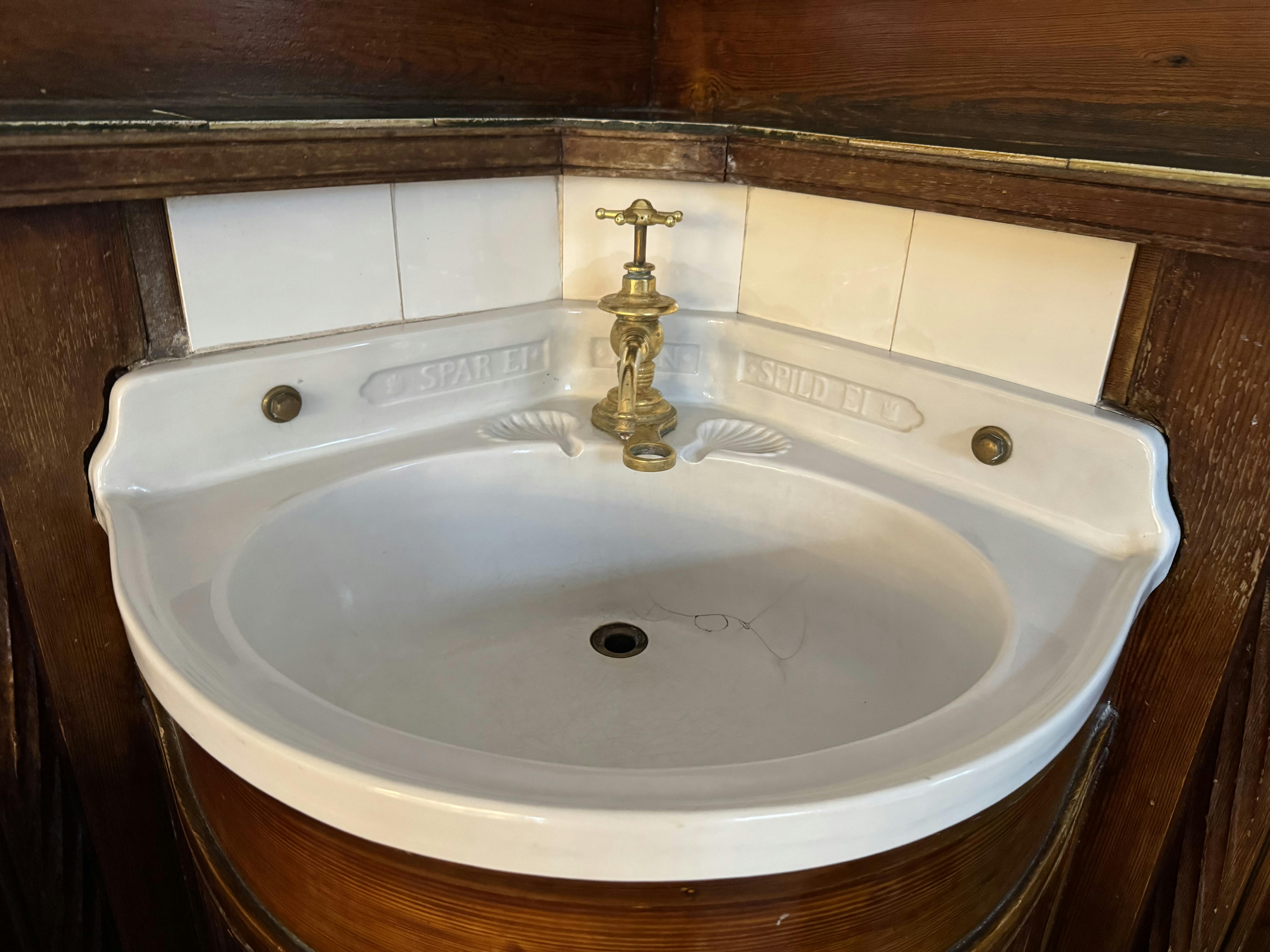 Murstensbygning med sort tag, dansk flag, træer, parkerede biler og både fortøjet foran en kanal under en blå himmel.
