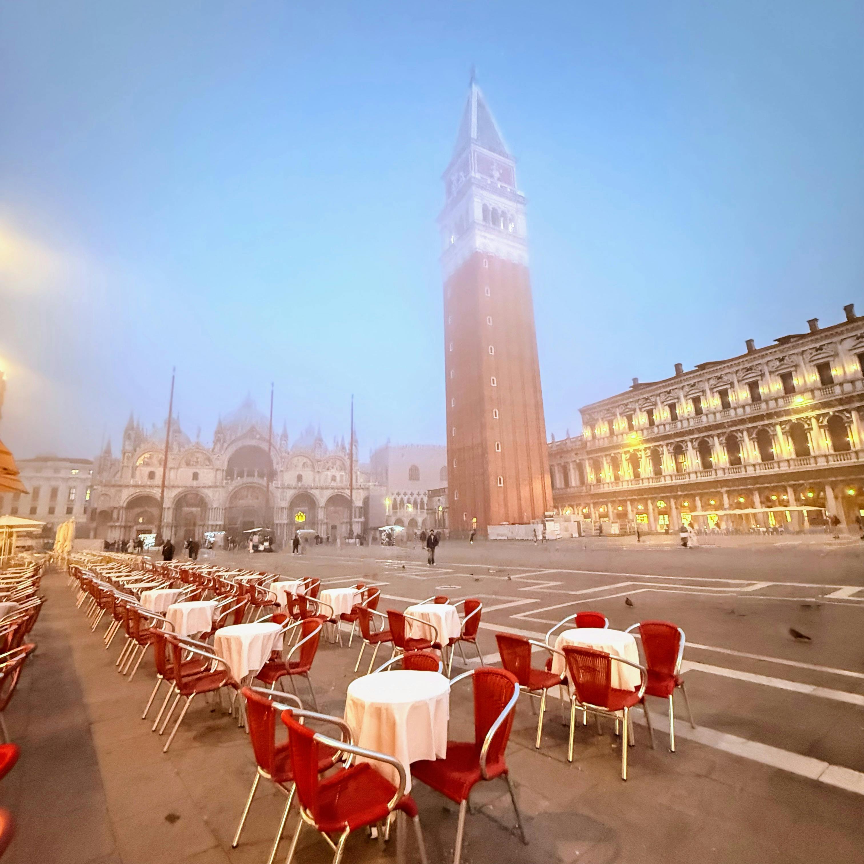 Markusklokketårnet, den højeste bygning i Venedig, ligger lige ved siden af basilikaen. Tag elevatoren op for at få en fantastisk udsigt over byen