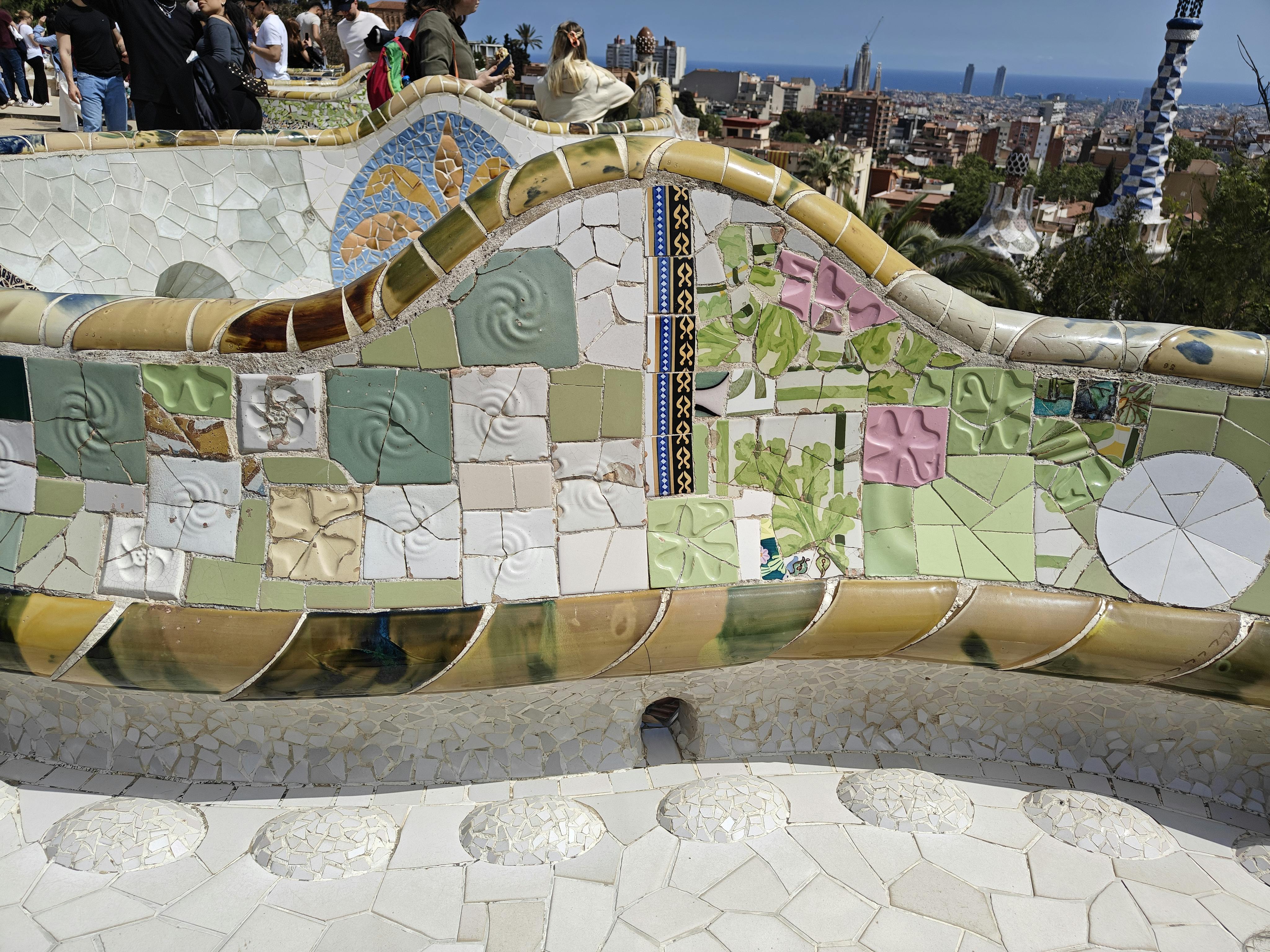 Rundt om kanten løber en lang, bølget bænk, der snor sig og bøjer sig som en levende form. Bagsiden af bænken er dækket af farverige trencadís, lavet af knækkede fliser, tallerkener og glas, der er sat i flydende mønstre.