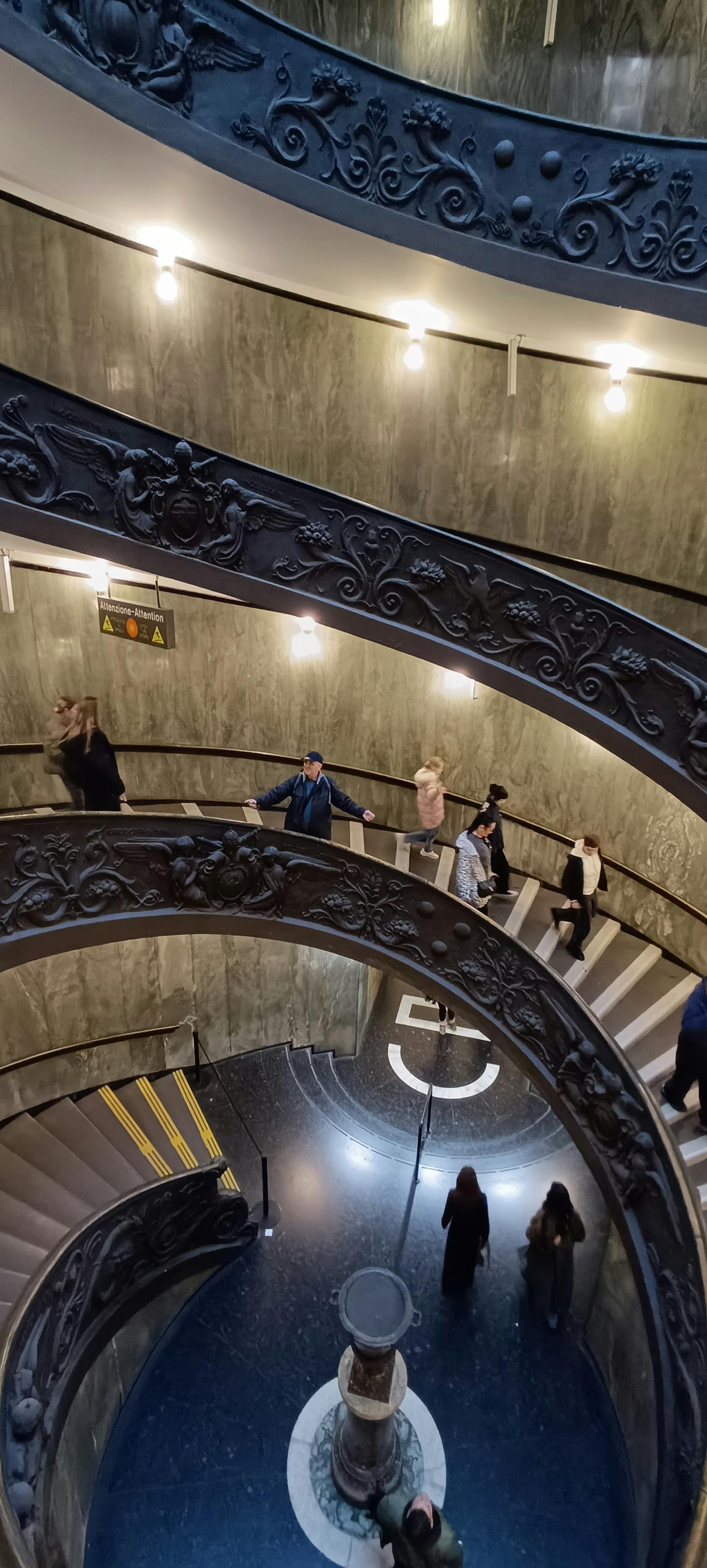Dette unikke dobbelte design var oprindeligt inspireret af Bramante's originale trappe fra 1505. Hvert trin ned skaber en svimlende spiraleffekt, når besøgende kigger ind i hvirvelstrømmen, en storslået finale for at afslutte dit besøg på Vatikanmuseet.