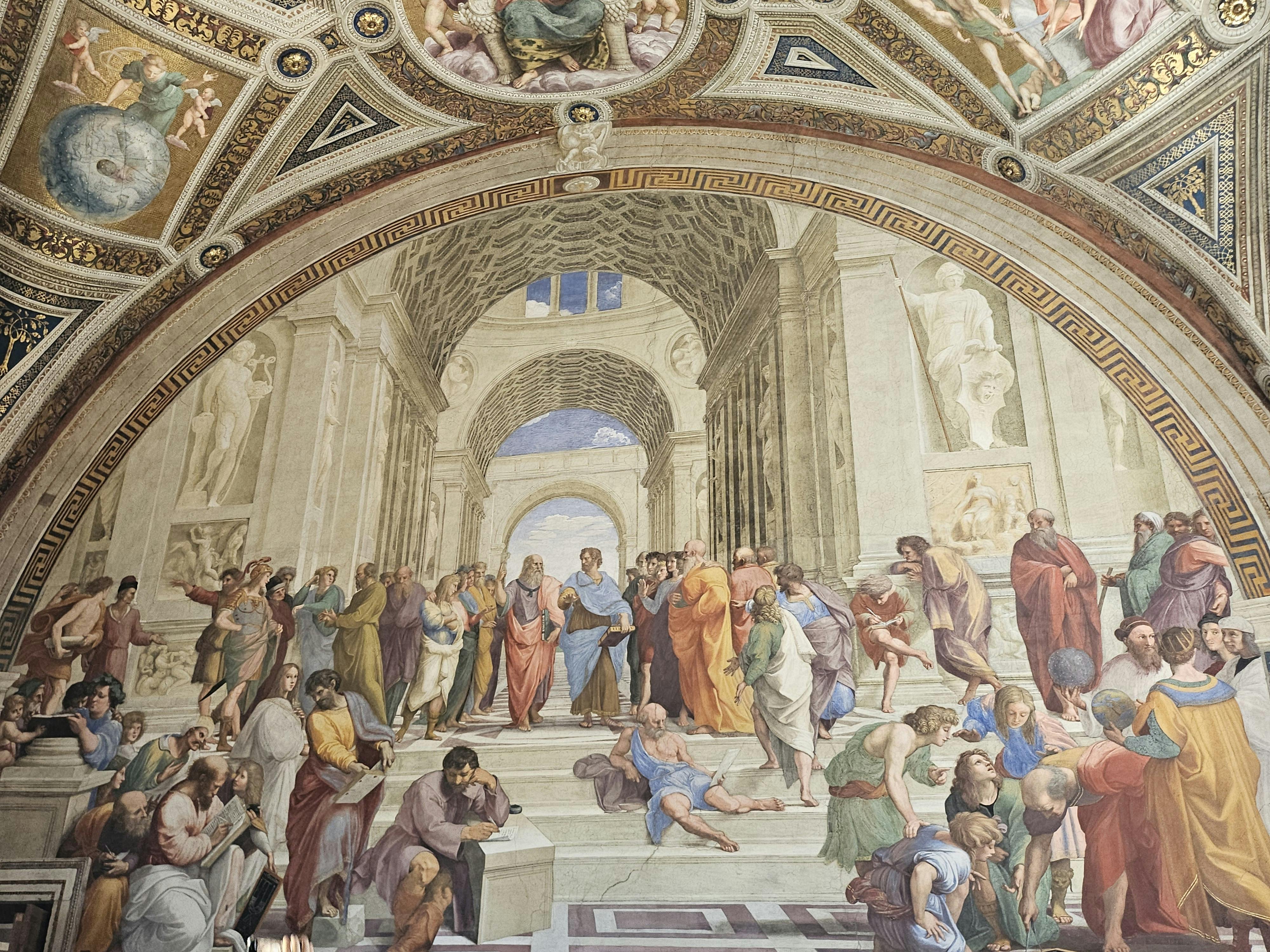Den mest berømte, Skolen i Athen, skildrer græske filosoffer Platon og Aristoteles i centrum, der diskuterer modstridende ideer, omgivet af andre store hoveder fra antikken. Symbolerne, sammensætningen og brugen af perspektiv viser de sofistikerede teknikker, der blev brugt af Raphael under højrenæssancen.