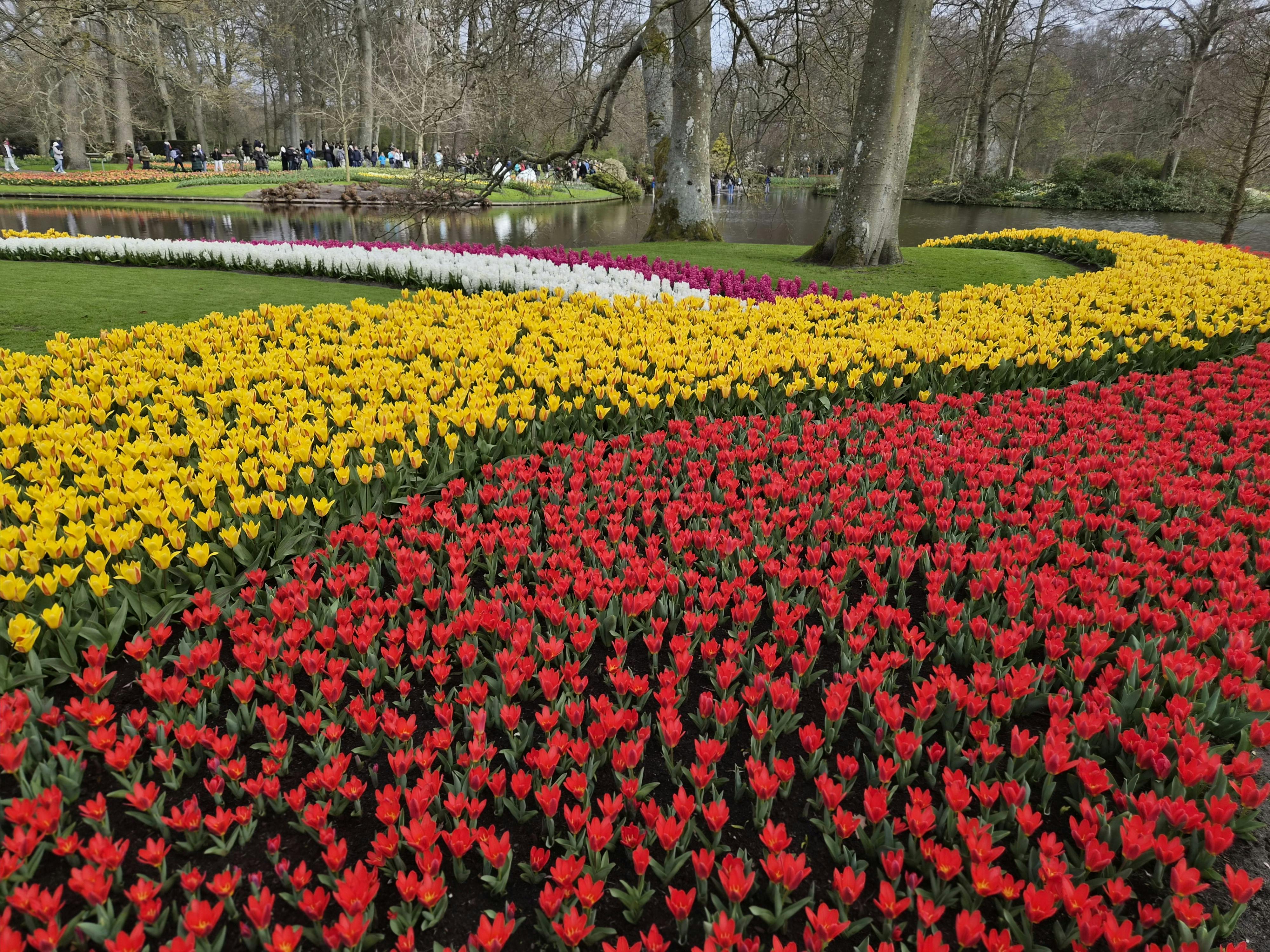 Ein farbenfroher Tulpengarten an einem ruhigen Fluss, umgeben von Bäumen mit verstreuten Besuchern im Hintergrund.