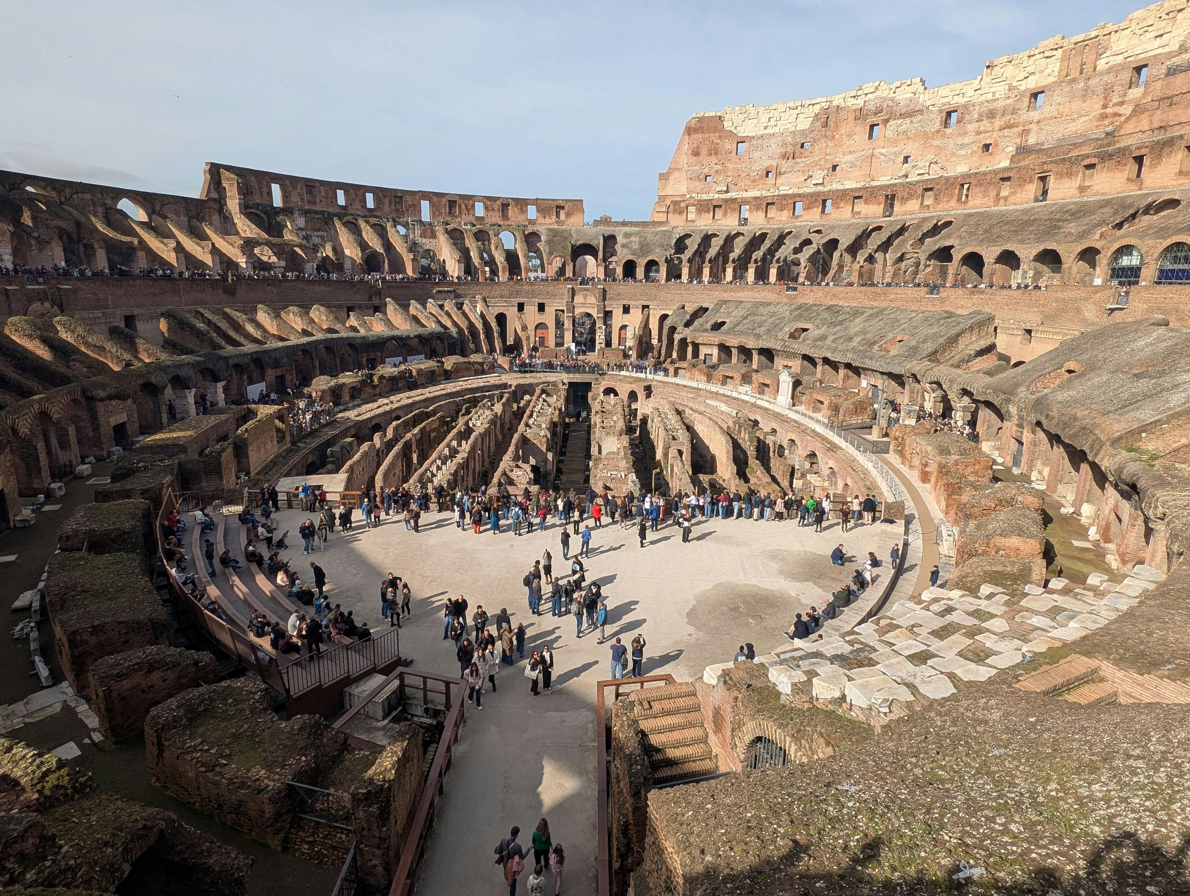 Mit dem Standardeintritt betreten Sie den Hauptinnenraum und genießen den klassischen Blick von den unteren Ebenen. Sie blicken hinunter in Richtung Arena und auf die freiliegende Struktur des Hypogäums, des unterirdischen Bereichs, in dem einst die Aufführungen stattfanden.