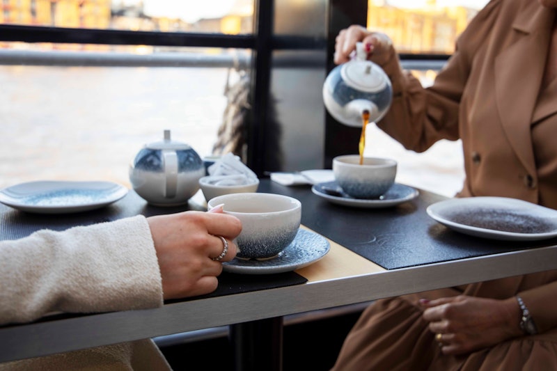 Heben Sie die Arme, während Sie auf einer Bootstour auf der Themse in London eine Tasse Tee schlürfen.
