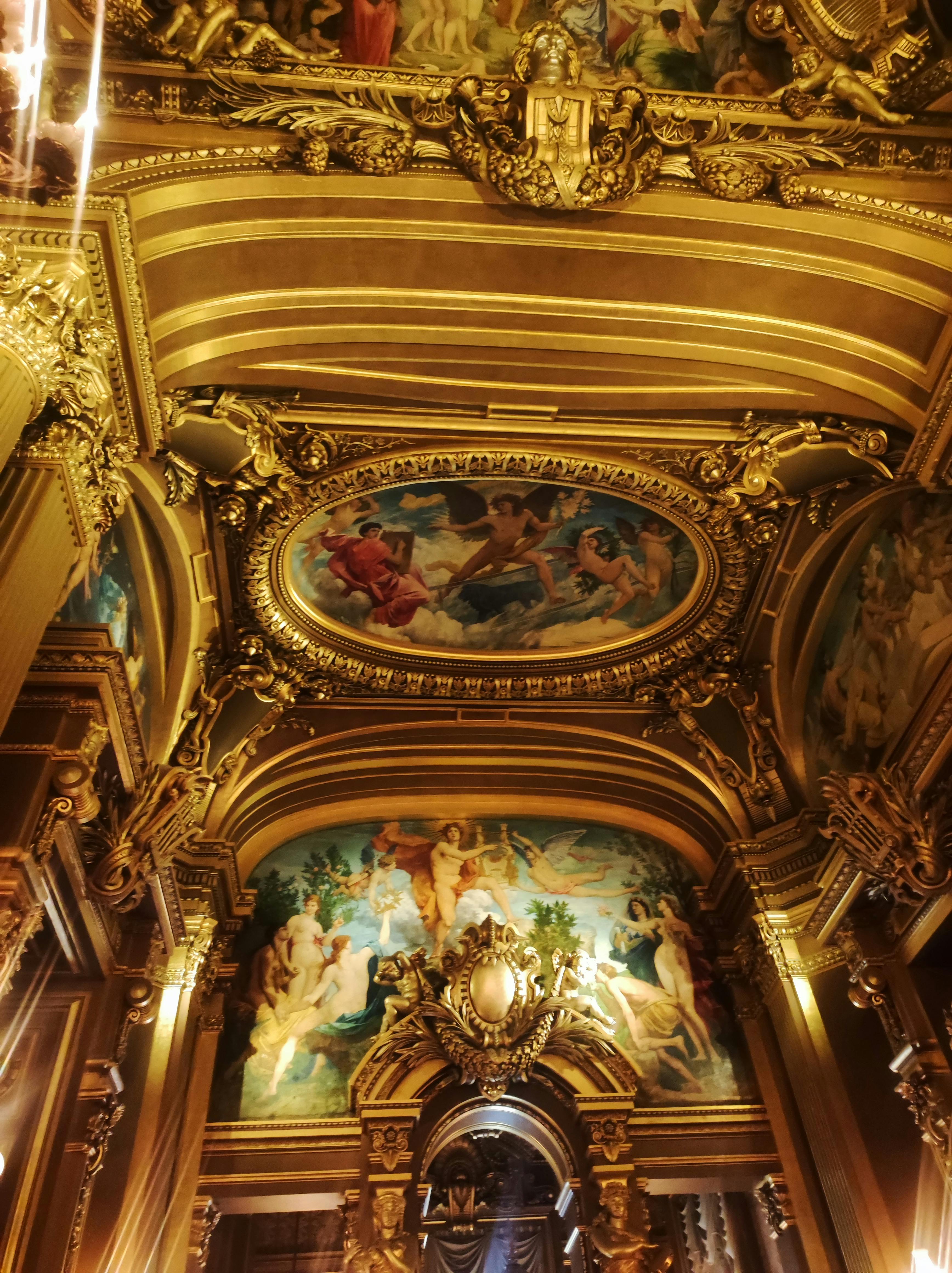 Das Grand Foyer, das dem Spiegelsaal von Versailles nachempfunden ist, ist eine lange, kunstvolle Galerie mit Vergoldungen, Kristalllüstern und Gemälden über Musik und Kunst von Paul Baudry.