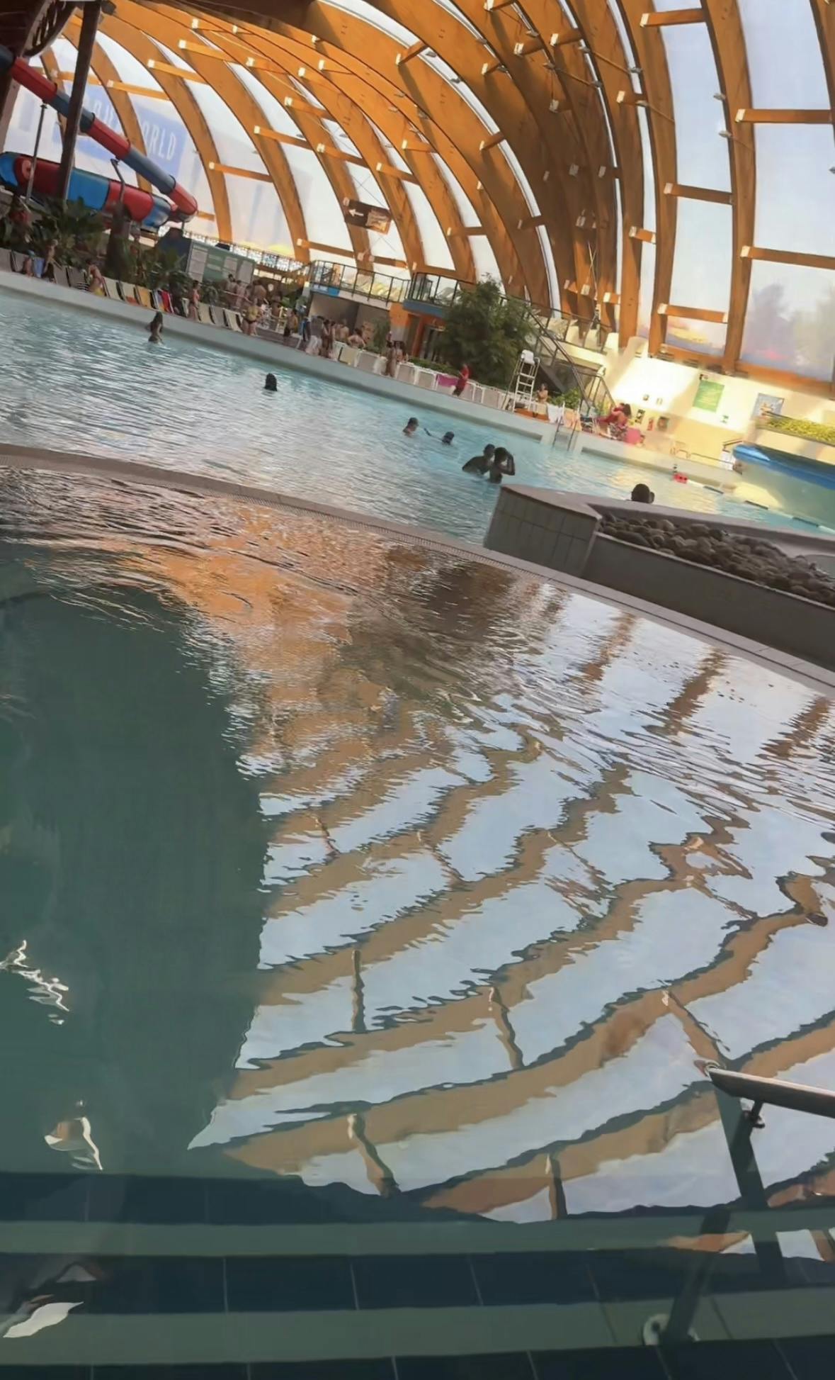 Indoor-Wasserpark mit zahlreichen Menschen, die in Becken schwimmen, in Wellen spielen und faulenzen. Gewölbtes Holzdach und Wasserrutschen.