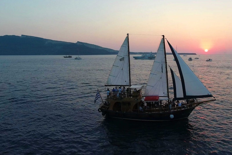 Πλεύστε σε μια γαλήνια και ρομαντική περιπέτεια από το ιστορικό λιμάνι των Φηρών στις 15:30, με ένα γοητευτικό ξύλινο ιστιοφόρο. Σε μόλις ένα γρήγορο ταξίδι 10 λεπτών, το πλοίο φτάνει στο γραφικό λιμάνι της Νέας Καμένης, όπου βρίσκεται ένα ενεργό ηφαίστειο. Εδώ, οι επισκέπτες μπορούν να περάσουν μια μαγευτική 1 ώρα και 15 λεπτά εξερευνώντας το αδάμαστο τοπίο με τα ποικίλα ηφαιστειακά πετρώματα και τους ενεργούς κρατήρες που εκπέμπουν καπνό και την έντονη μυρωδιά του θείου.