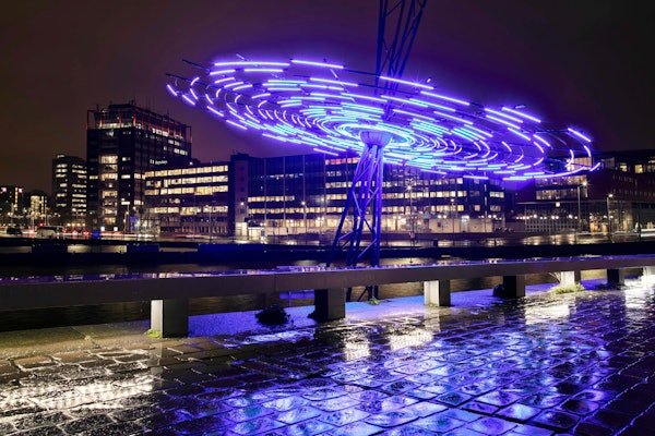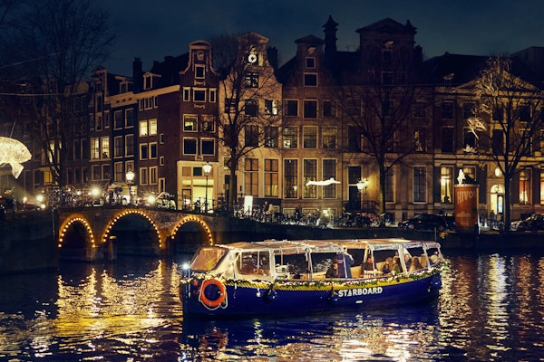 The modern, fully electric boat shields from the elements as it sails through Amsterdam. As the twilight sky deepens, the boat glides past a beautiful gallery of 20 radiant art installations, each casting a unique glow upon the waterway.
