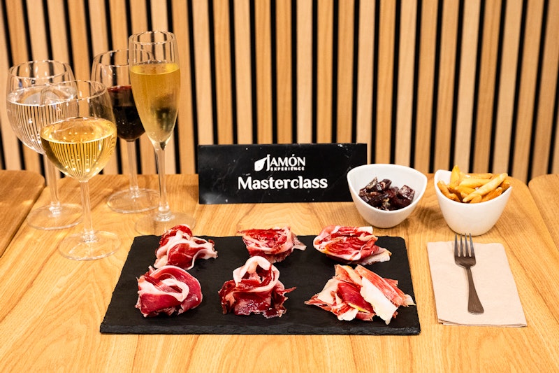 During the session, a professional will guide you through seven jamón varieties, including Paleta Gran Reserva, Paleta 50% Ibérico Cebo, Paleta 50% Ibérico Campo, Paleta 50% Ibérico Bellota, Cubes of 50% Ibérico Bellota, Jamón 50% Ibérico Bellota, and Paleta 100% Ibérico Bellota, and explain how they differ.