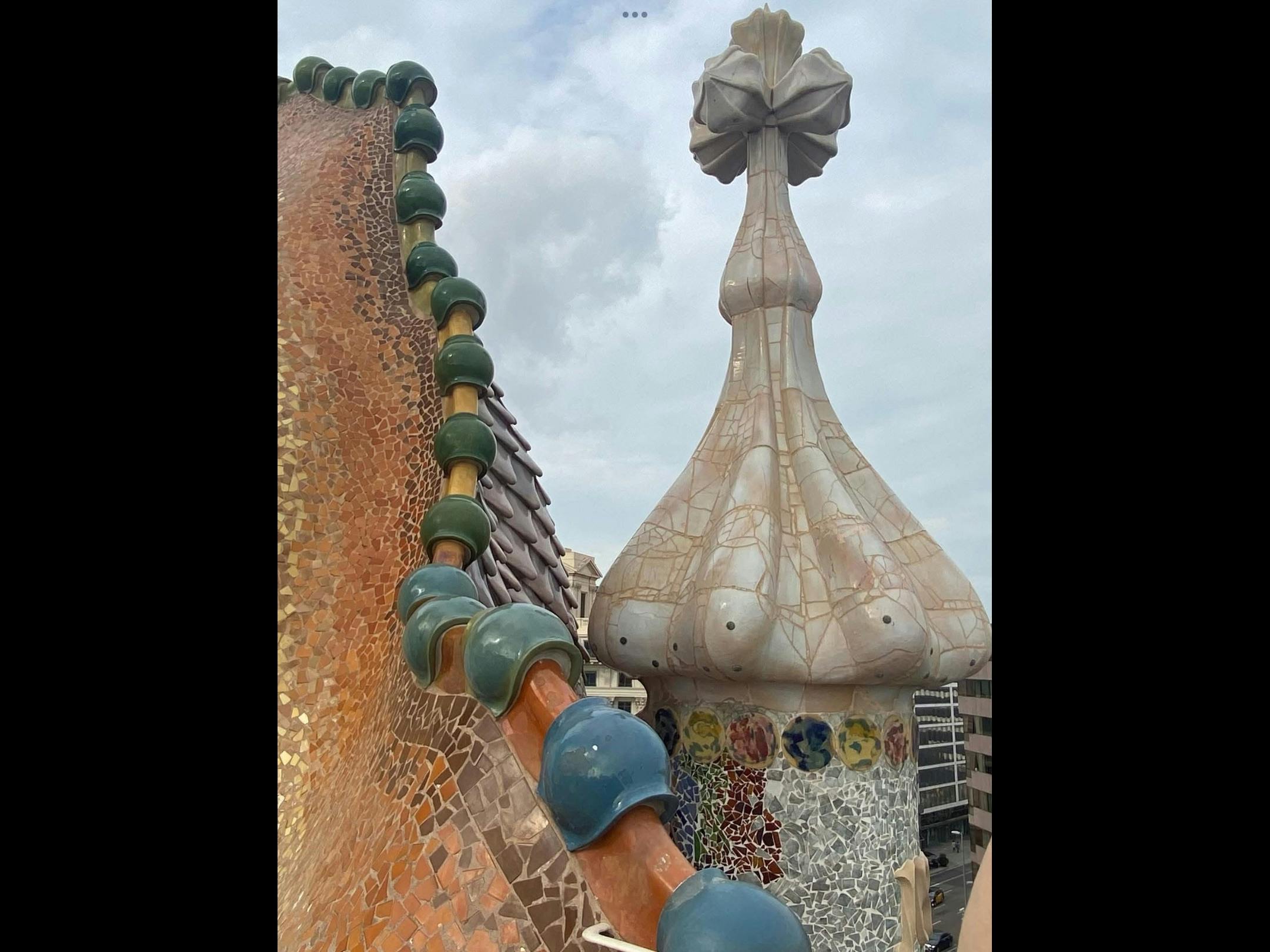 Catalonia shares its patron saint with England, St. George, who legend has it, tamed and/or slew a dragon some time in the 3rd century CE. There are consequently hundreds of dragon images all over Barcelona, and Gaudí had his hand in quite a few of them. Most notably, his El Drac lizard in Park Güell, and the Casa Batlló dragon roof.