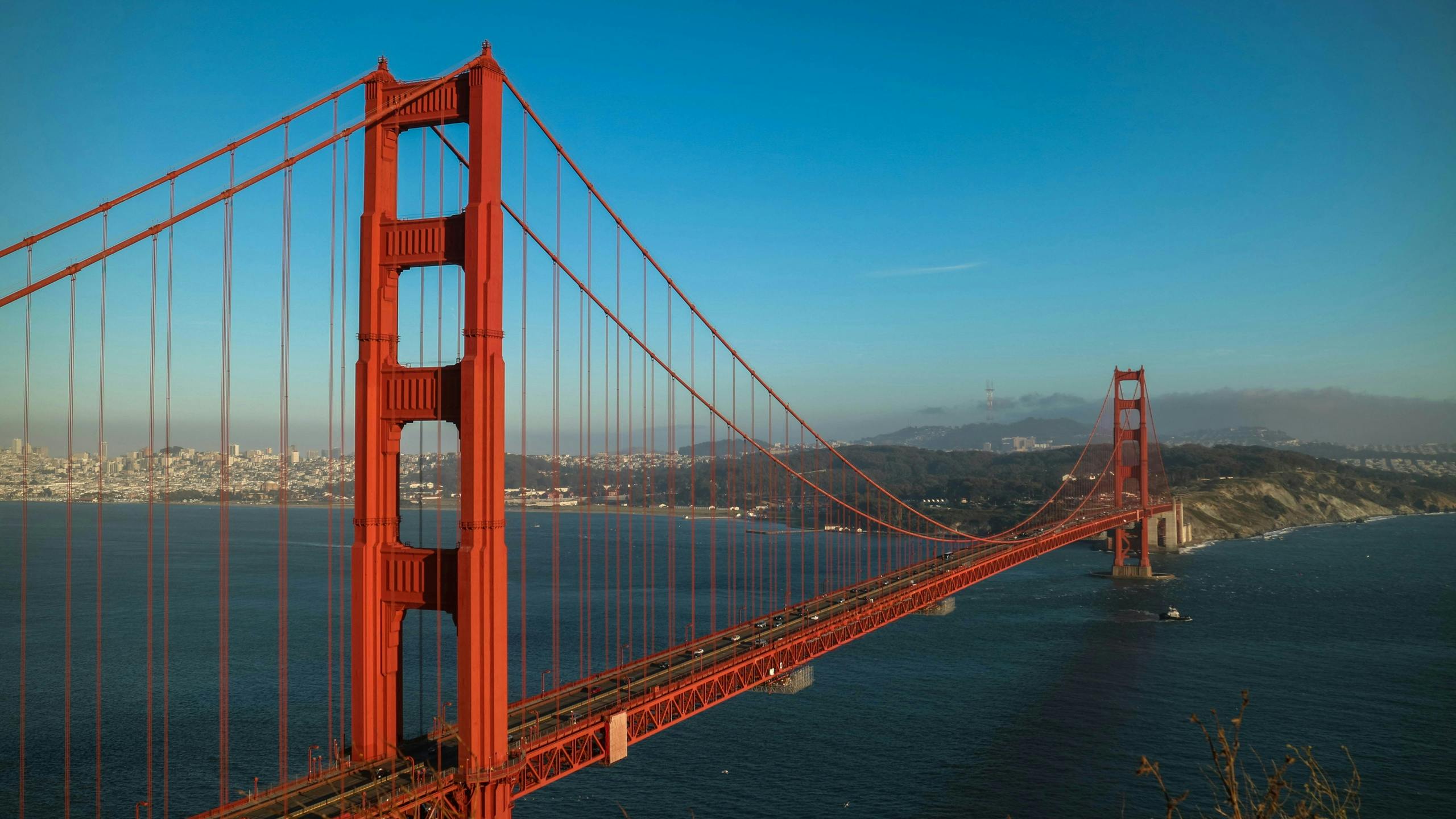 A sightseeing boat sails under the Golden Gate Bridge with passengers on deck, set against a clear blue sky and rocky hillside.