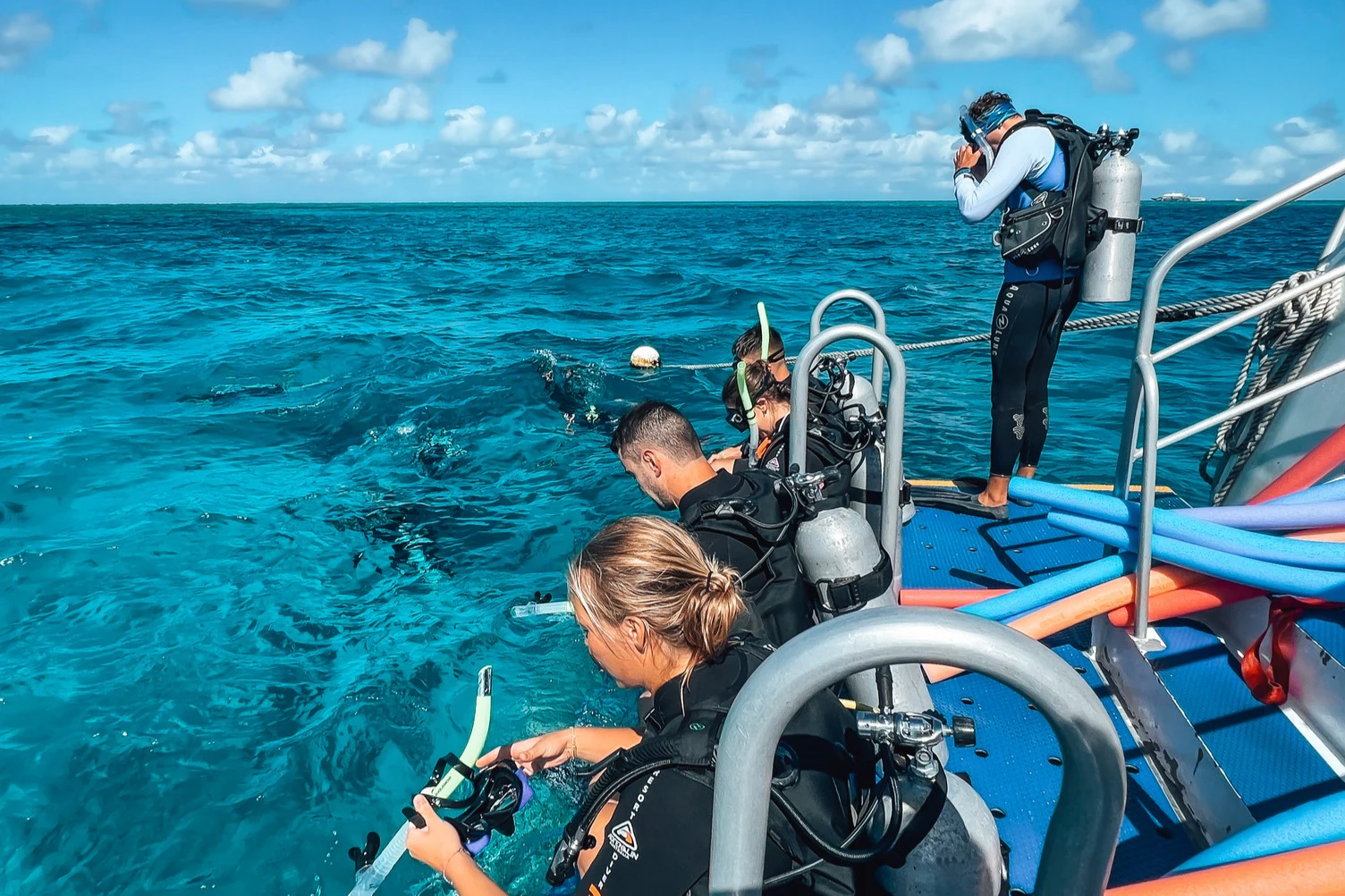 Scuba divers on a boat preparing to enter the clear blue ocean, with one diver already in the water and others checking their gear.
