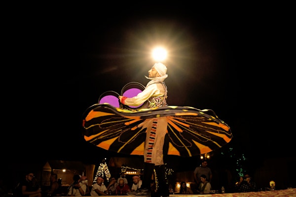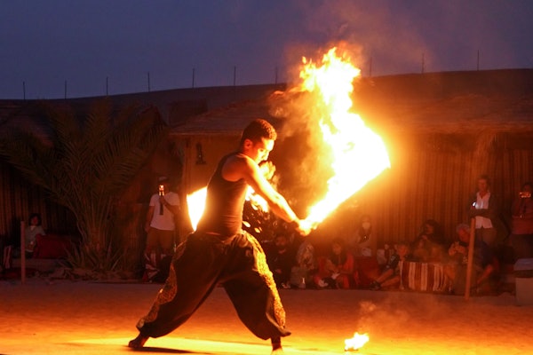 La aventura continúa en un campamento tradicional de estilo beduino. Allí, los huéspedes pueden interactuar y hacerse fotos con un majestuoso halcón, y maravillarse con hipnotizantes danzas del vientre, espectáculos de fuego y actuaciones de danza Tanoura.