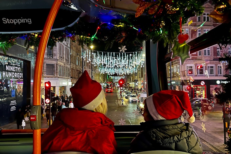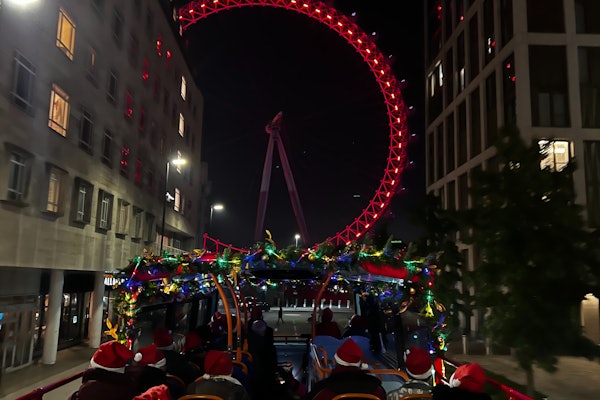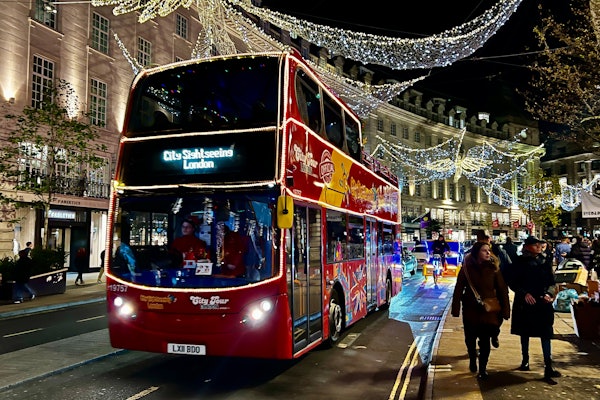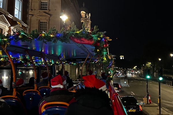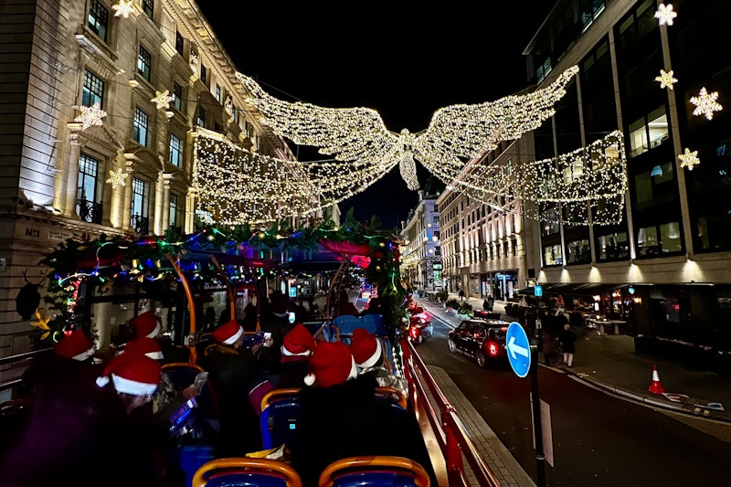 Londres se viste con sus mejores galas festivas, engalanada de luces. Pasarás por la famosa exhibición del Espíritu de la Navidad de Regent Street, con majestuosos ángeles que se elevan en medio de un impresionante espectáculo de luces. ¡No olvides tu cámara! La cubierta superior ofrece unas vistas despejadas que constituyen el telón de fondo perfecto para capturar tus recuerdos navideños.