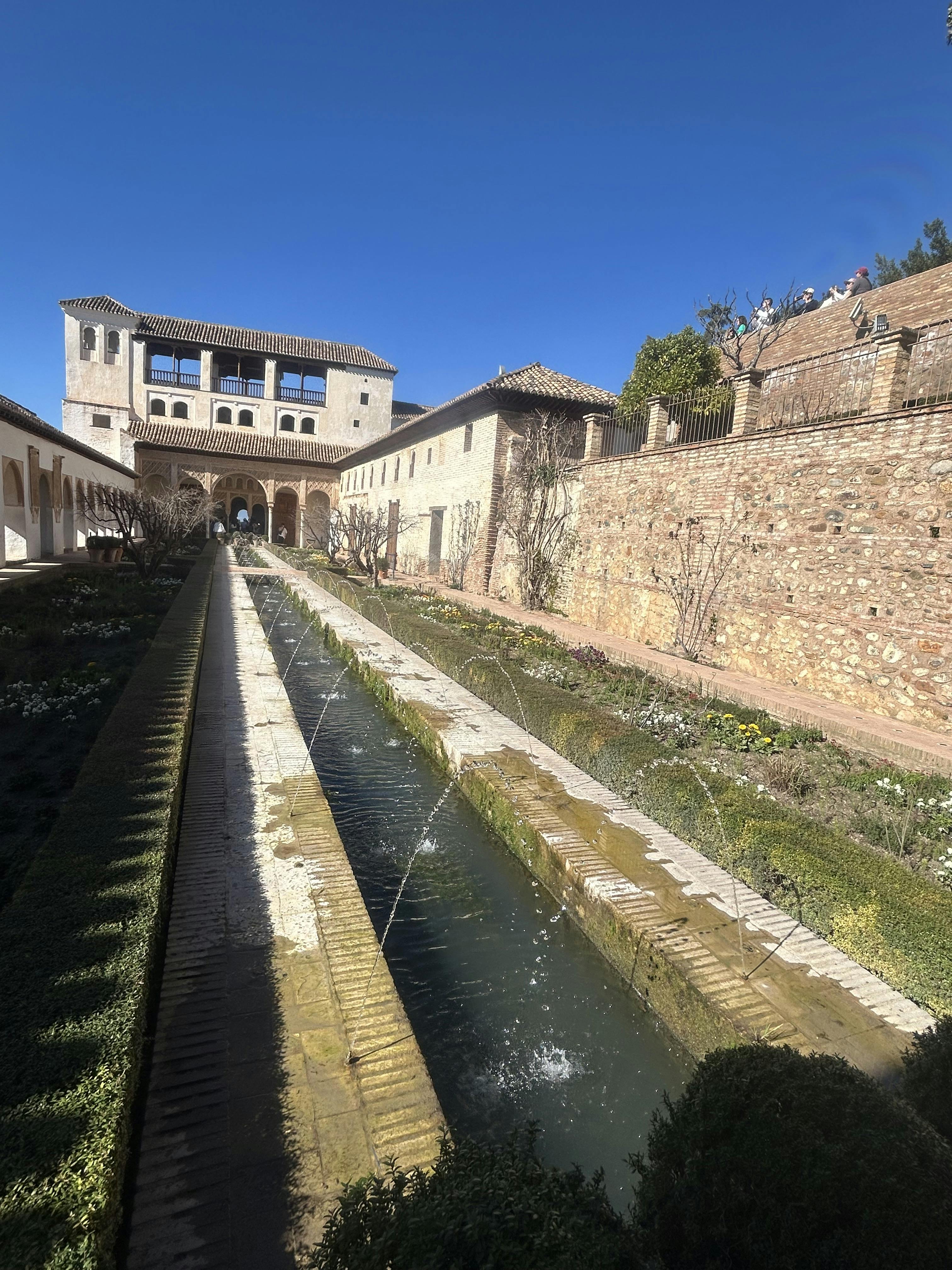 Escucha el refrescante sonido del agua del Patio de la Acequia, los fragantes olores de rosas y jazmines de los jardines, y las espectaculares vistas del barranco hacia los palacios principales.