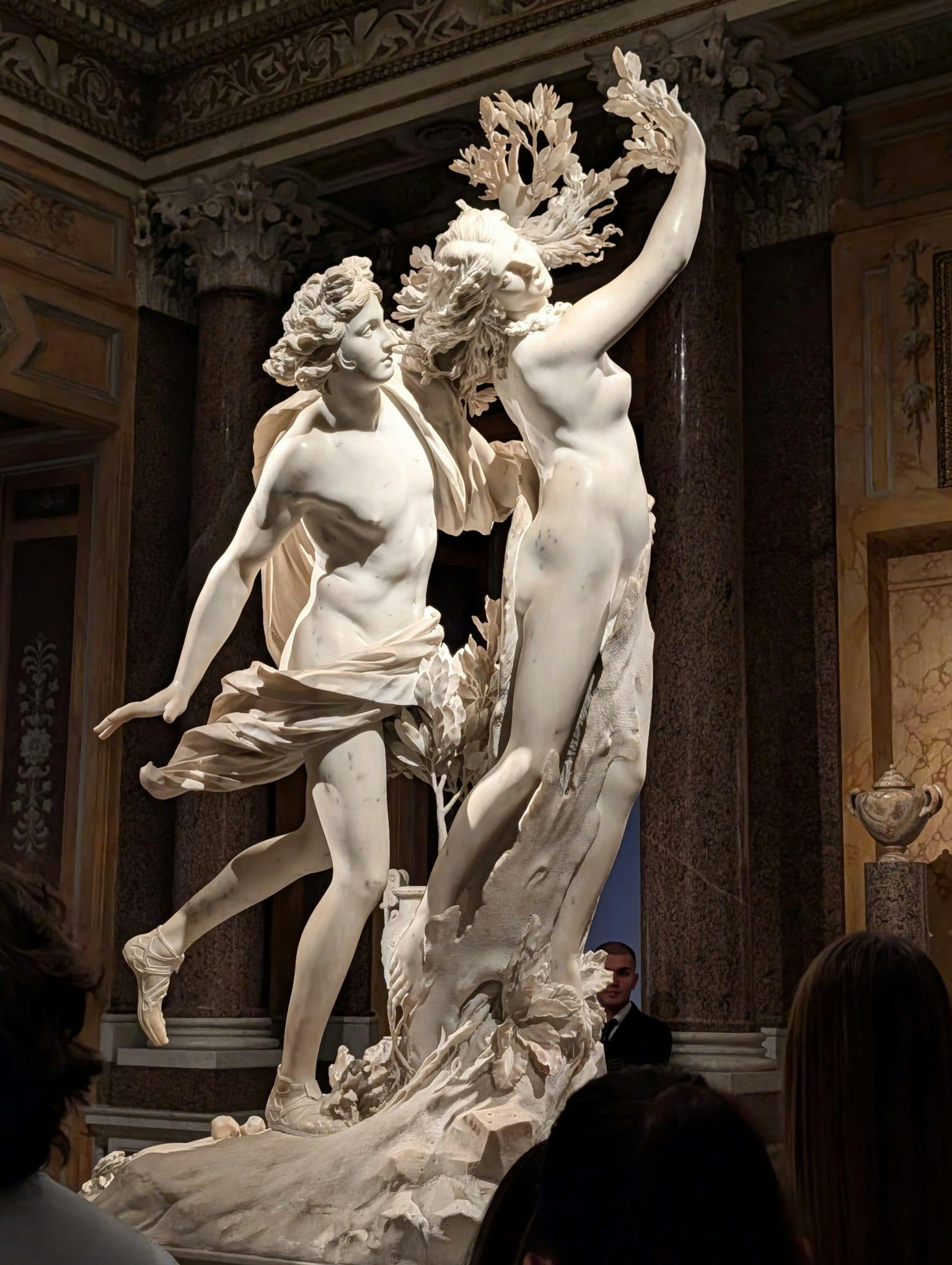 Cuando estés ante Apolo y Dafne, verás cómo Apolo tiende la mano a Dafne, y serás testigo del momento en que ella se convierte en un árbol de laurel. Sus dedos se convierten en hojas; sus dedos, enraizados en el suelo. Los delicados detalles hacen que esta escena sea casi real. Sientes la tensión y la urgencia mientras la expresión de Apolo muestra sorpresa y anhelo.