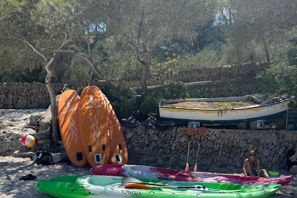 Naviguez dans les eaux claires de la Cala Santanyi et faites de la plongée avec masque et tuba à la Cala Llombards. Départ de la Cala Santanyi et navigation commune jusqu'à Es Pontas, où vous pourrez prendre des photos pour vos vacances.