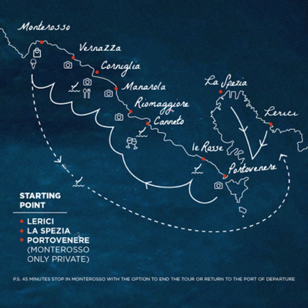 Au départ de Lerici, La Spezia ou Portovenere (Monterosso pour les visites privées), le bateau vous emmène vers le golfe des Poètes et Portovenere. Surnommée la "sixième ville des Cinque Terre", cette zone historique abrite l'étonnante grotte de Byron et l'église de San Pietro. Prenez des photos avant de vous rafraîchir et de goûter à la focaccia.
