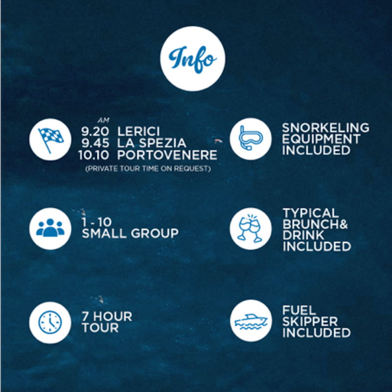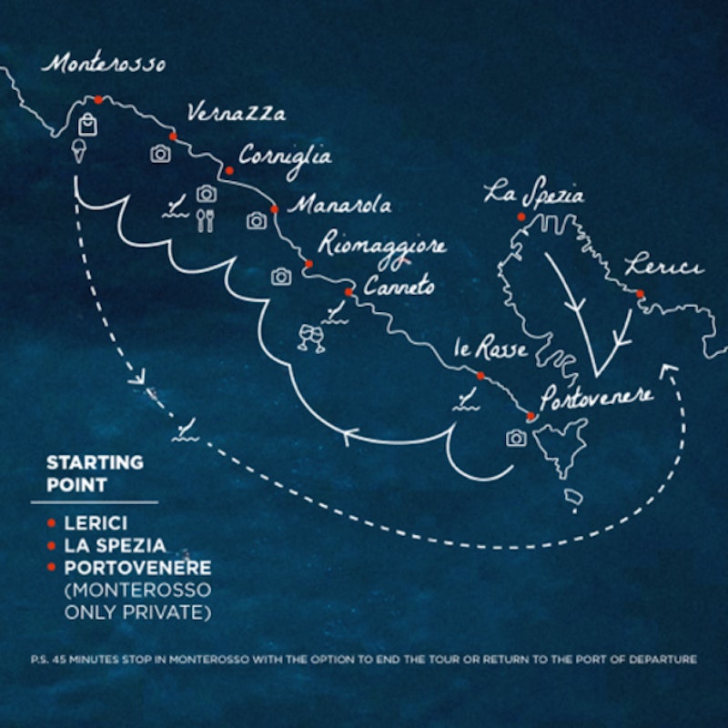 En vous dirigeant vers les Cinque Terre, découvrez les villages cachés entre Portovenere et Riomaggiore, visibles uniquement depuis la mer. Nagez près d'une cascade naturelle avant d'entrer dans le parc national des Cinque Terre. Naviguez le long des cinq villes, en vous arrêtant près de Corniglia pour explorer une petite grotte et plonger du haut des falaises.