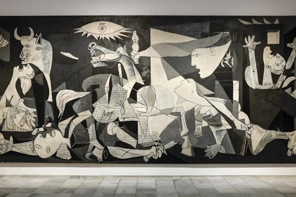 Des visiteurs observent le tableau "Guernica" de Picasso dans un musée. Les guides sont assis sur des chaises à proximité de l'œuvre.