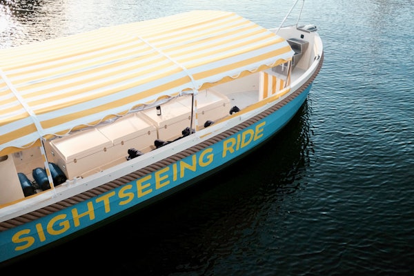 Recherchez les panneaux et les casquettes portant le nom et le logo de Sightseeing Ride près du quai.