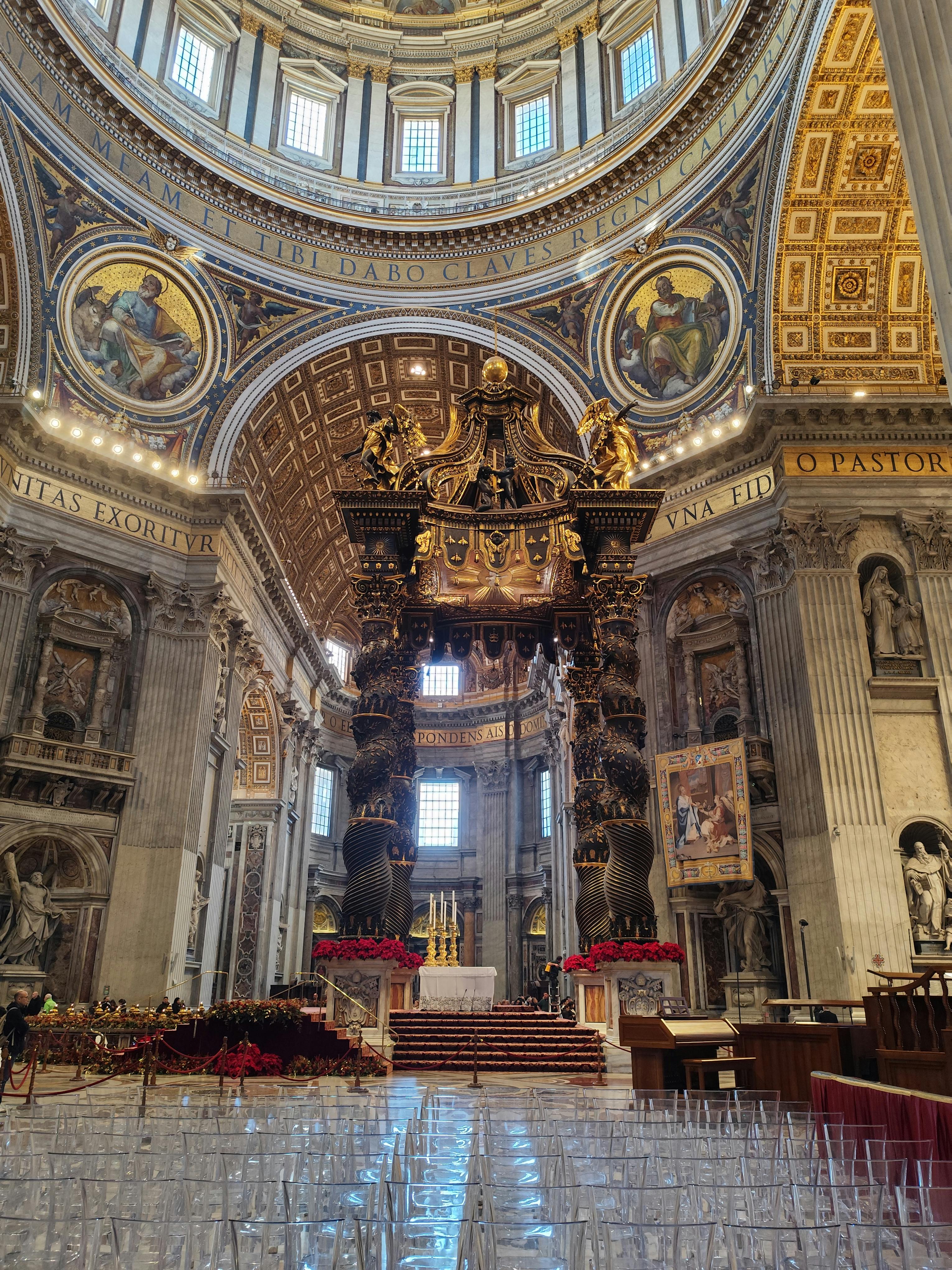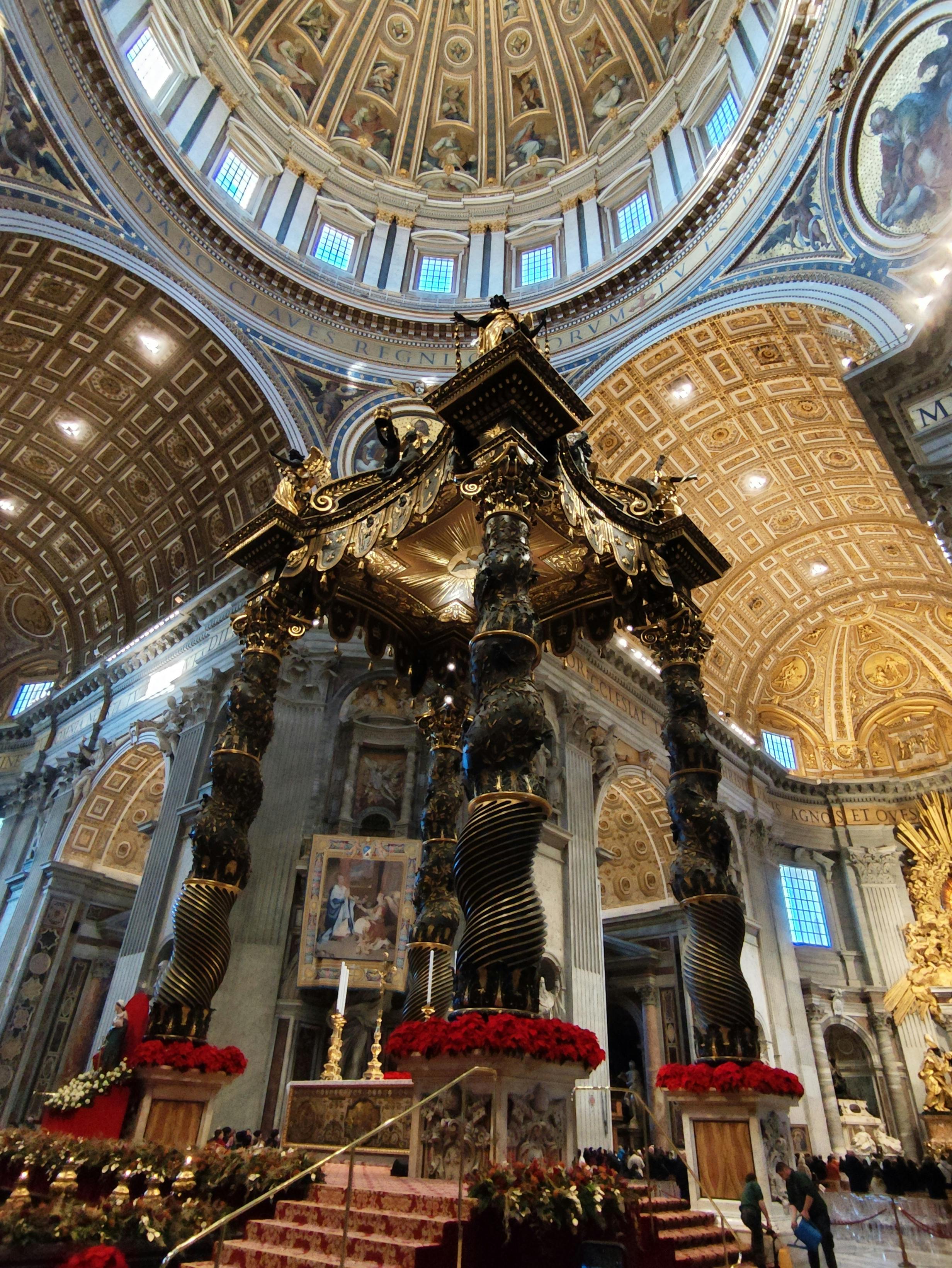 Le Baldacchino se trouve directement au-dessus du tombeau de Saint-Pierre, reliant ainsi l'église actuelle à ses anciennes racines. Sa taille imposante et son design complexe dominent l'espace central et attirent le regard vers le haut.