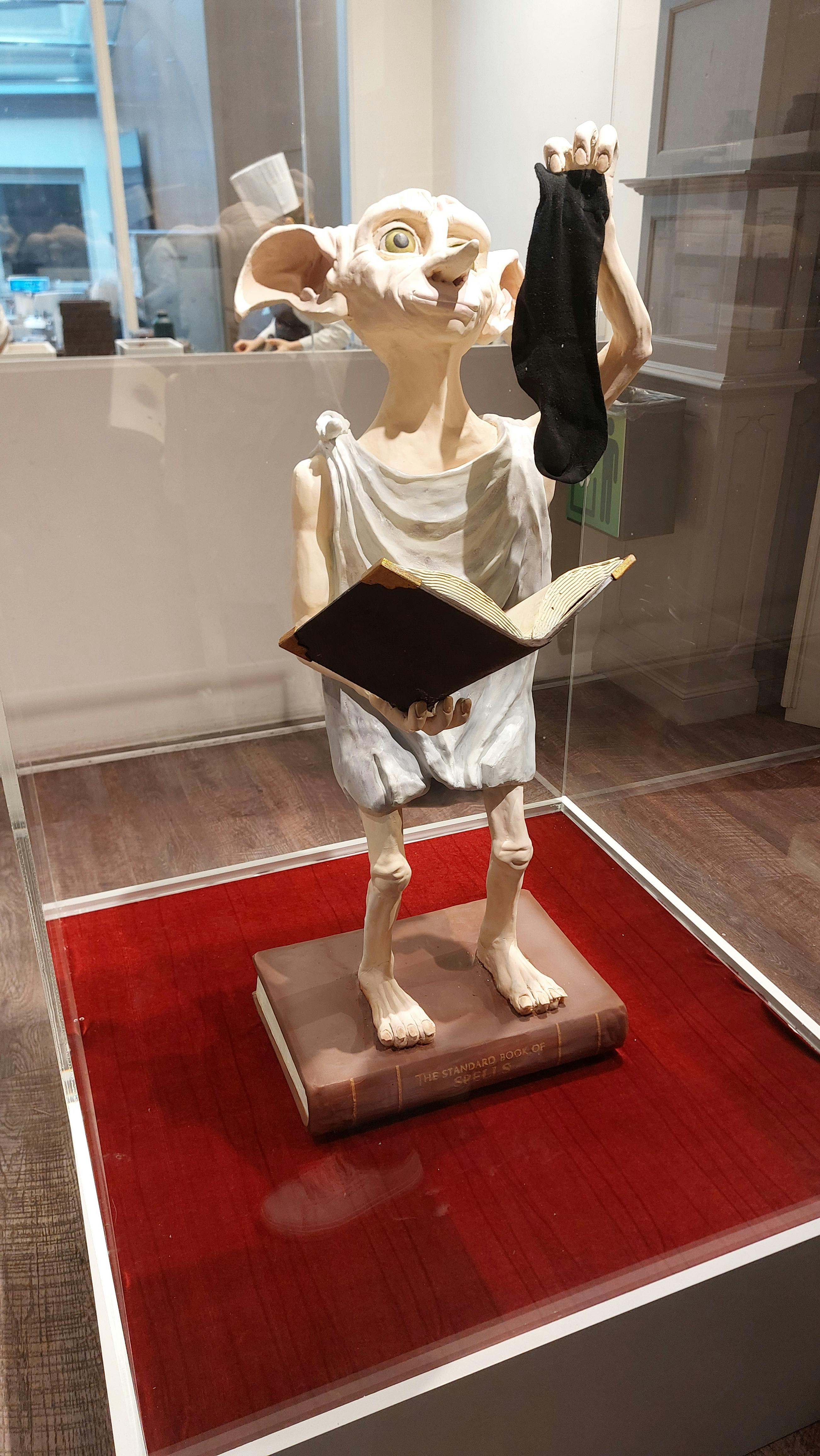 Un mur orné de diverses œuvres d'art encadrées. Une sculpture représentant des frites dans un récipient recouvert d'une carte est placée devant.
