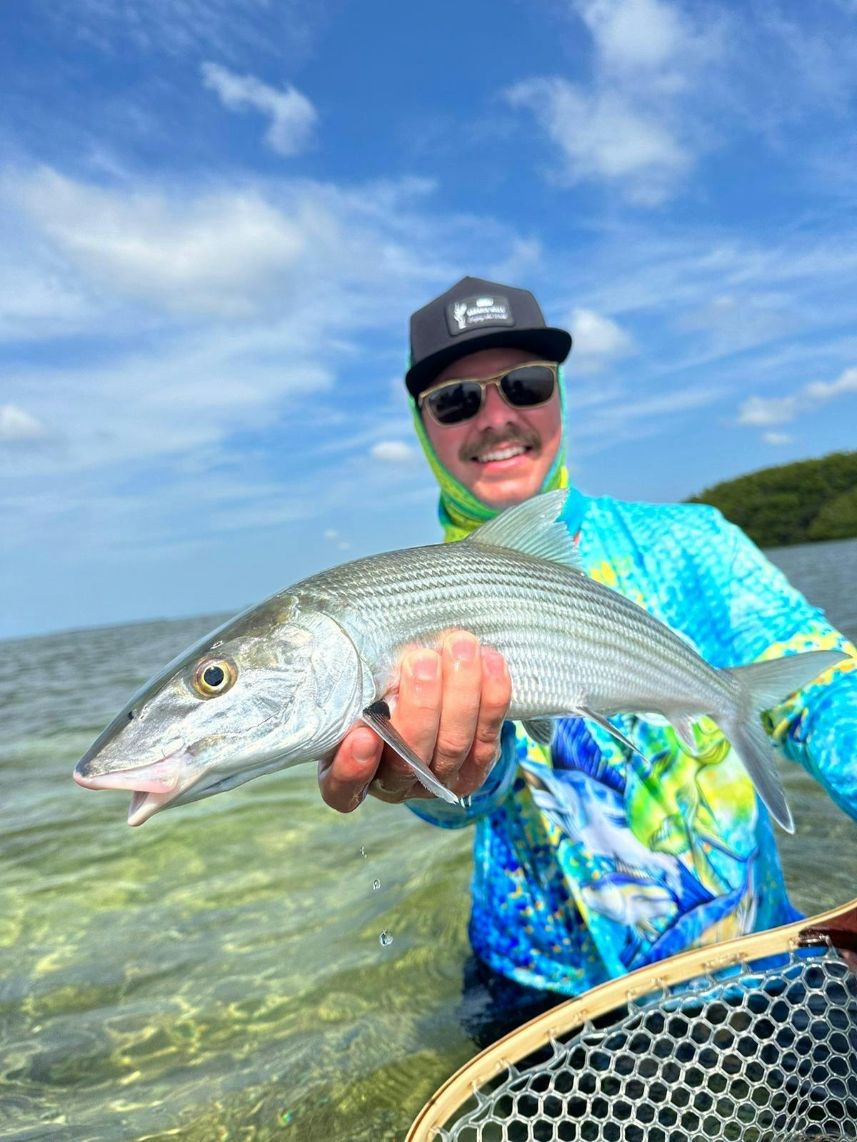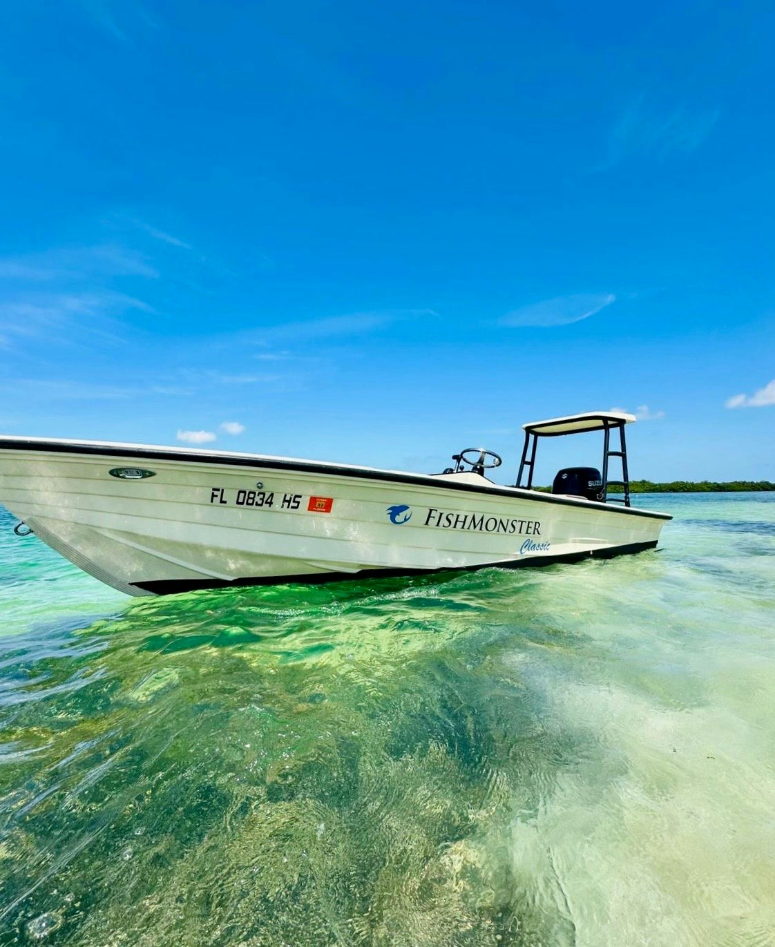Un bateau à moteur blanc portant l'inscription "FishMonster" flotte dans une eau turquoise claire et peu profonde, sous un ciel d'un bleu éclatant.