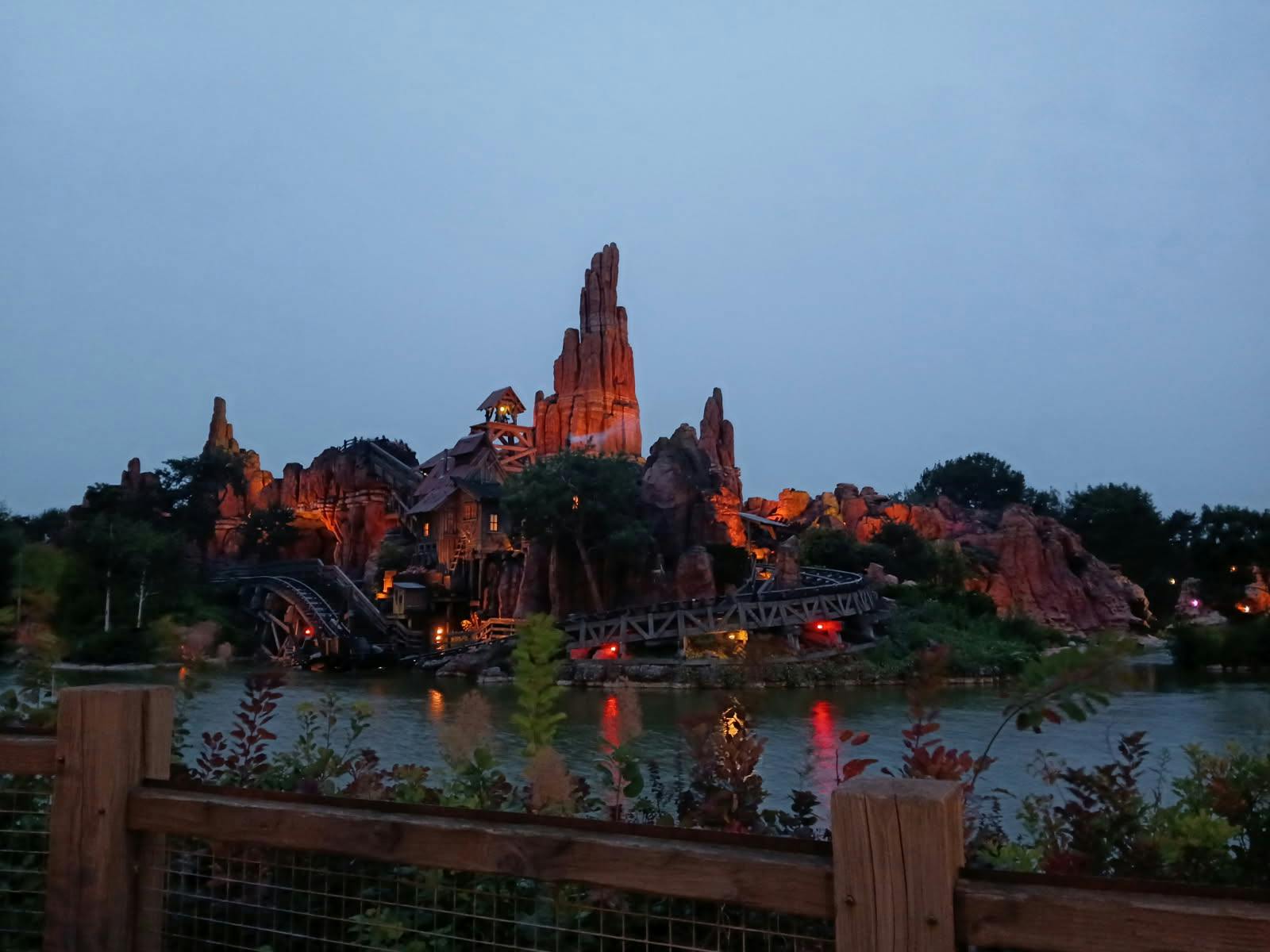 Frontierland Le Far West américain, avec un grand lac, des paysages de roches rouges et une ambiance de ville fluviale. La thématique est très forte, depuis les trottoirs en bois jusqu'aux détails de la gare.
