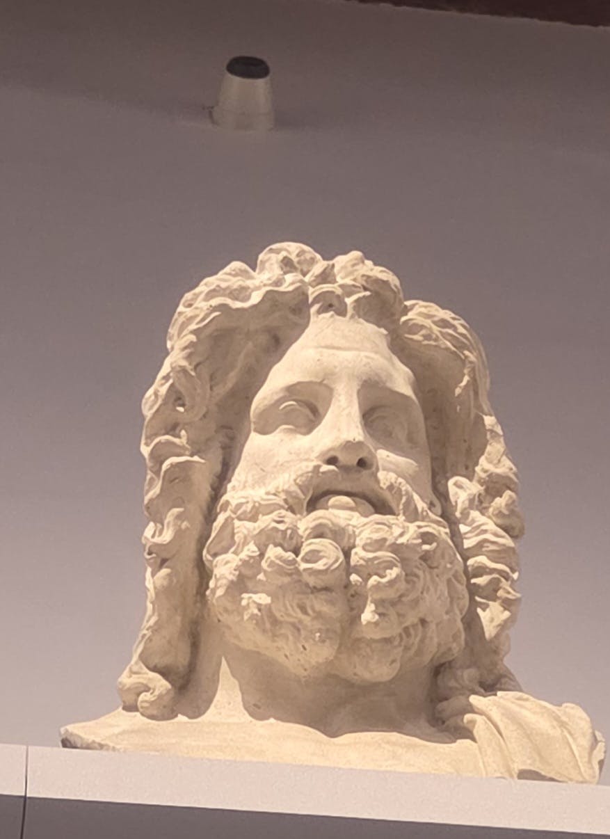 Une grande statue en marbre d'un homme nu se trouve sous un plafond en dôme et en arc avec une lucarne circulaire.