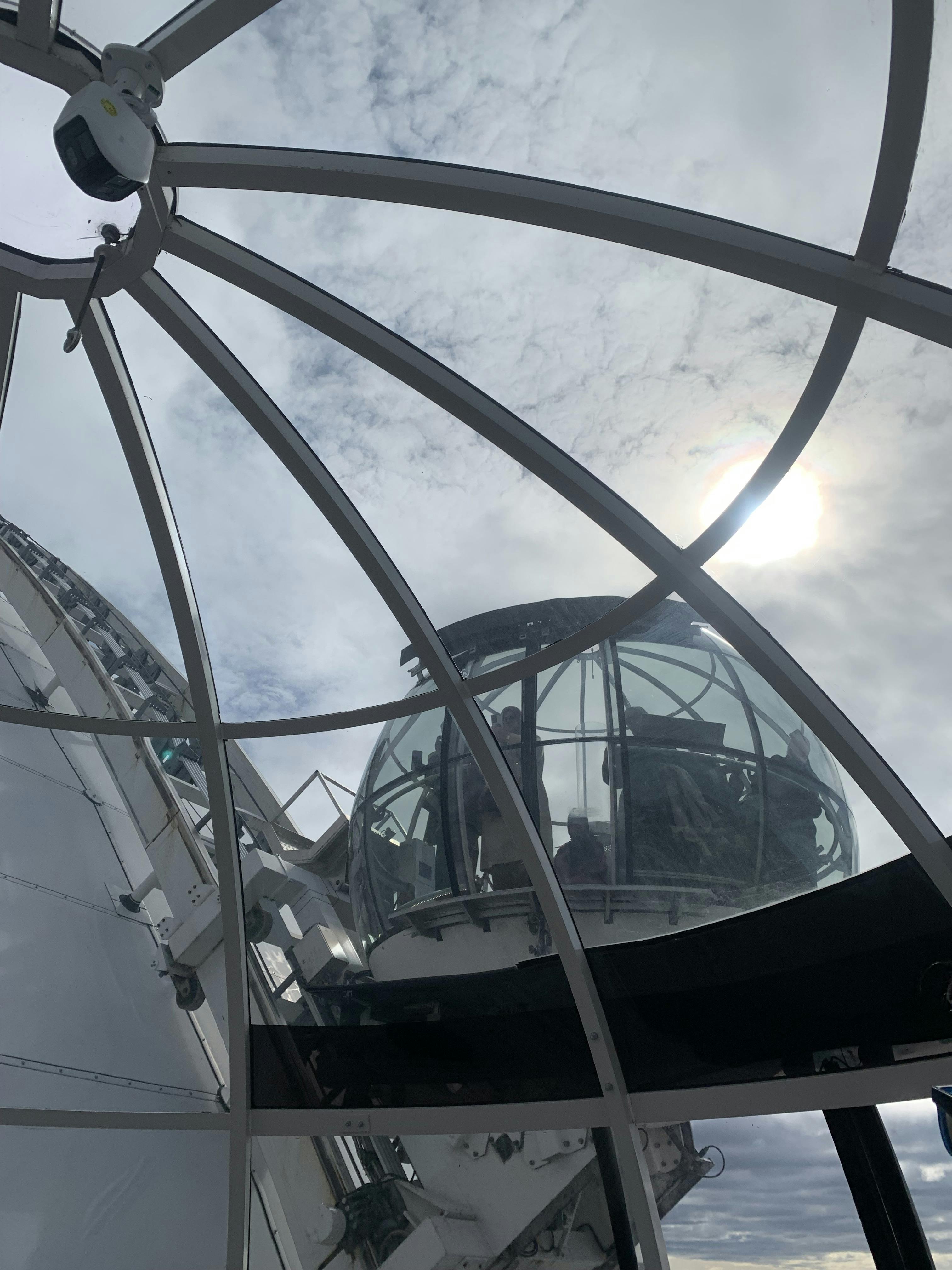 Grande structure blanche en forme de dôme avec des fenêtres circulaires et une nacelle en verre sur des rails. Une branche d'arbre est visible au premier plan.