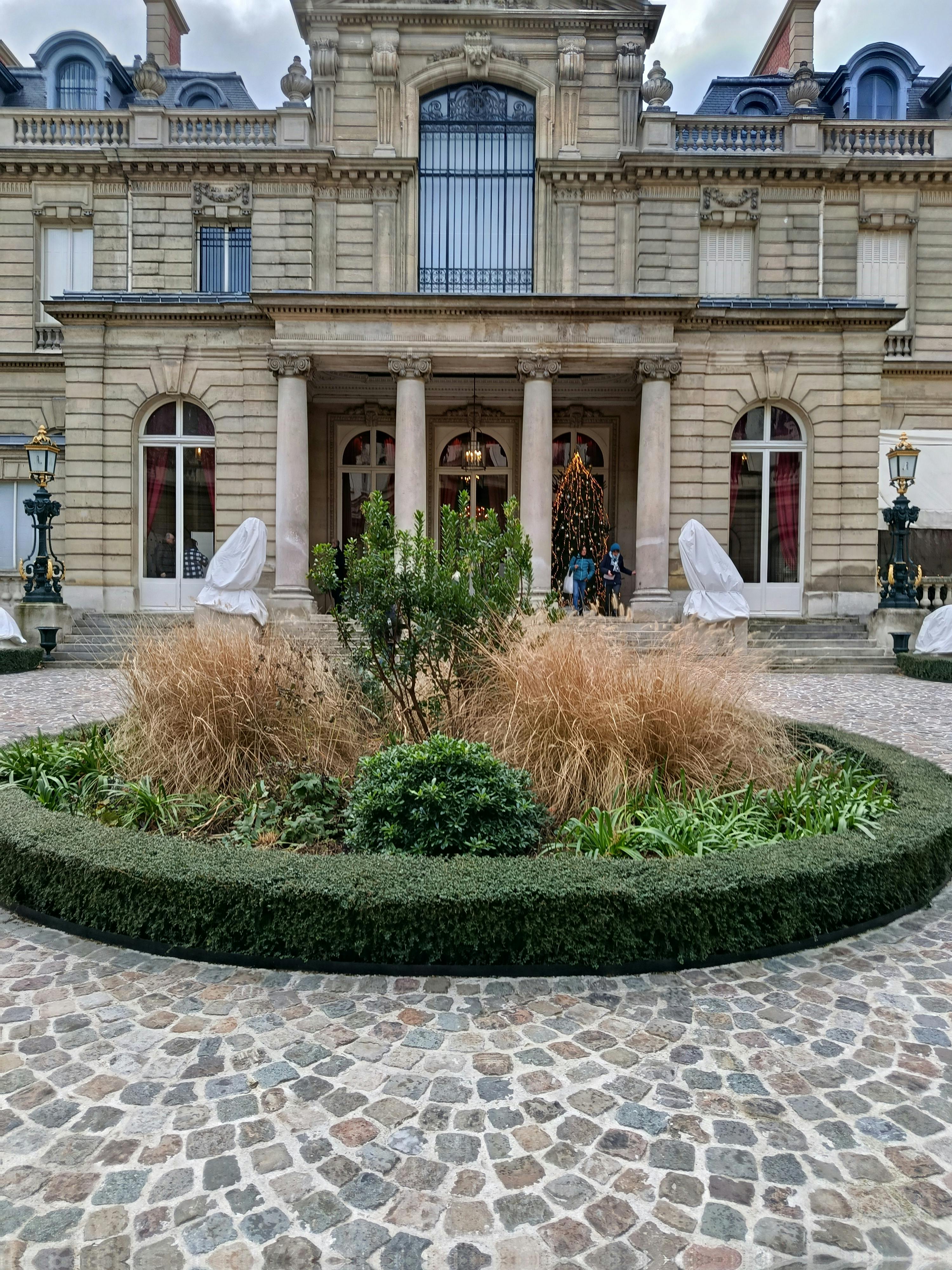 Un grand bâtiment historique avec de grandes fenêtres, des colonnes décoratives à l'entrée et une cour pavée. La statue d'un penseur assis, entourée de buissons coniques bien entretenus et de fleurs roses au premier plan.