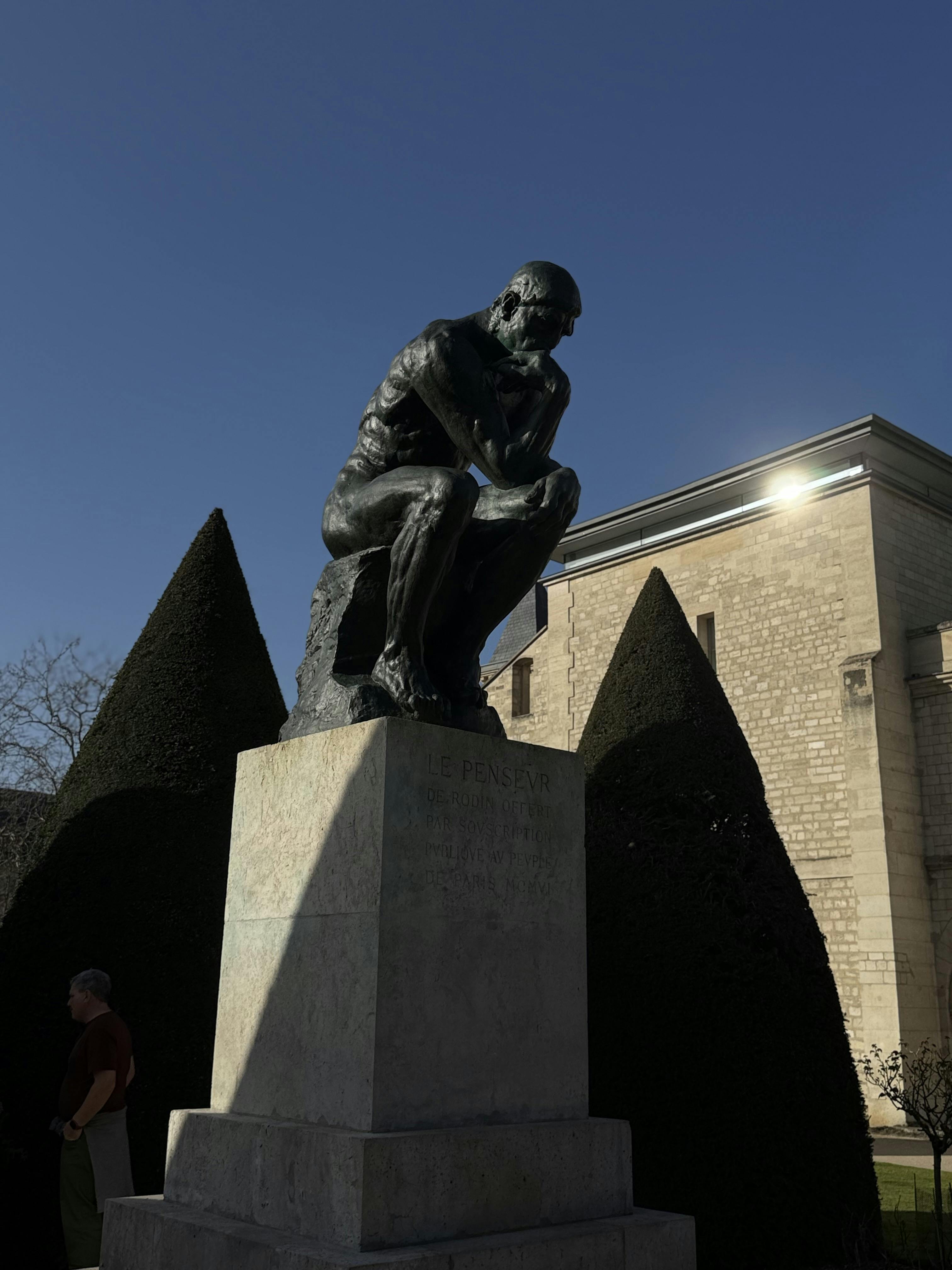 Un grand bâtiment historique avec de grandes fenêtres, des colonnes décoratives à l'entrée et une cour pavée. La statue d'un penseur assis, entourée de buissons coniques bien entretenus et de fleurs roses au premier plan.