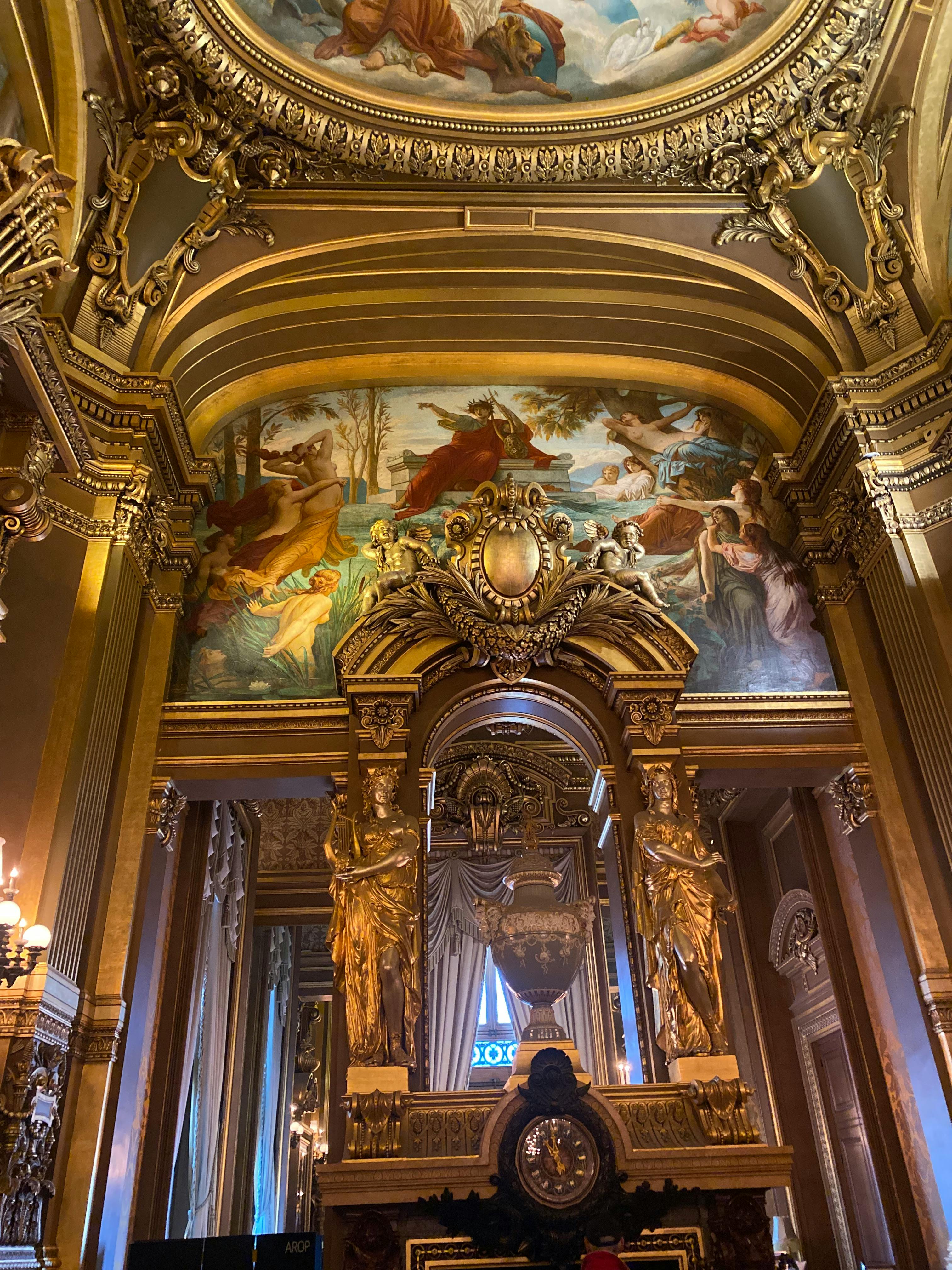Le Grand Foyer, inspiré de la Galerie des Glaces de Versailles, est une longue galerie ornée de dorures, de lustres en cristal et de peintures de Paul Baudry sur la musique et les arts.