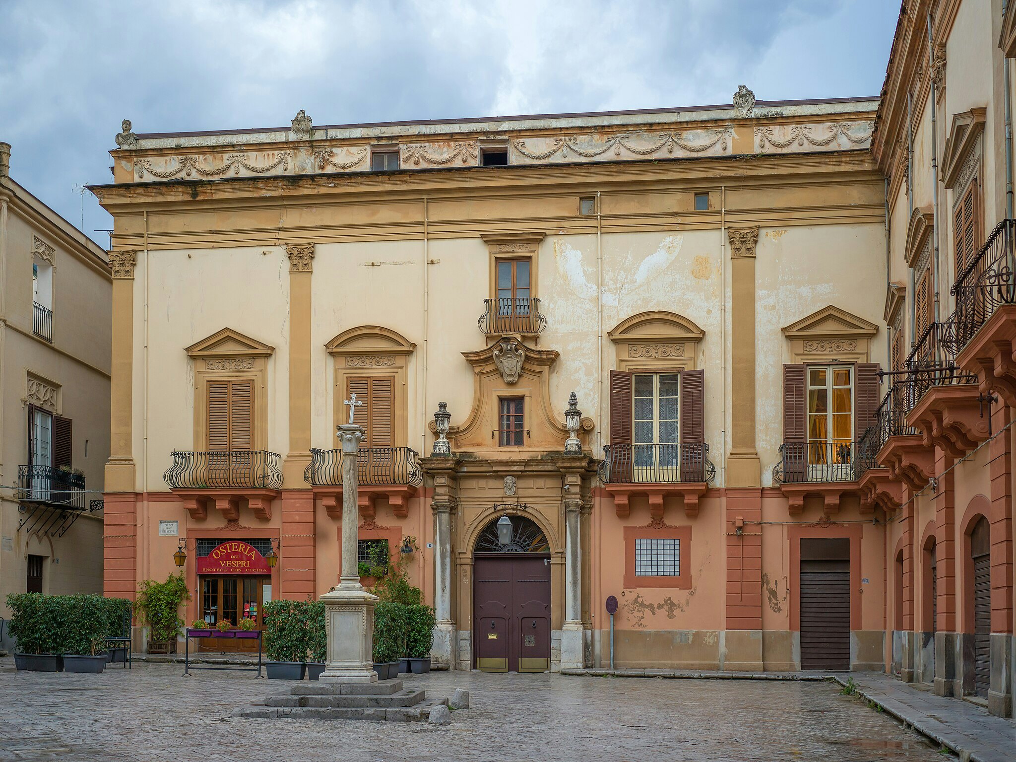 Un bâtiment historique avec des volets en bois fermés, des balcons ornés et une arche centrale. Au premier plan, un grand monument en forme de croix en pierre.