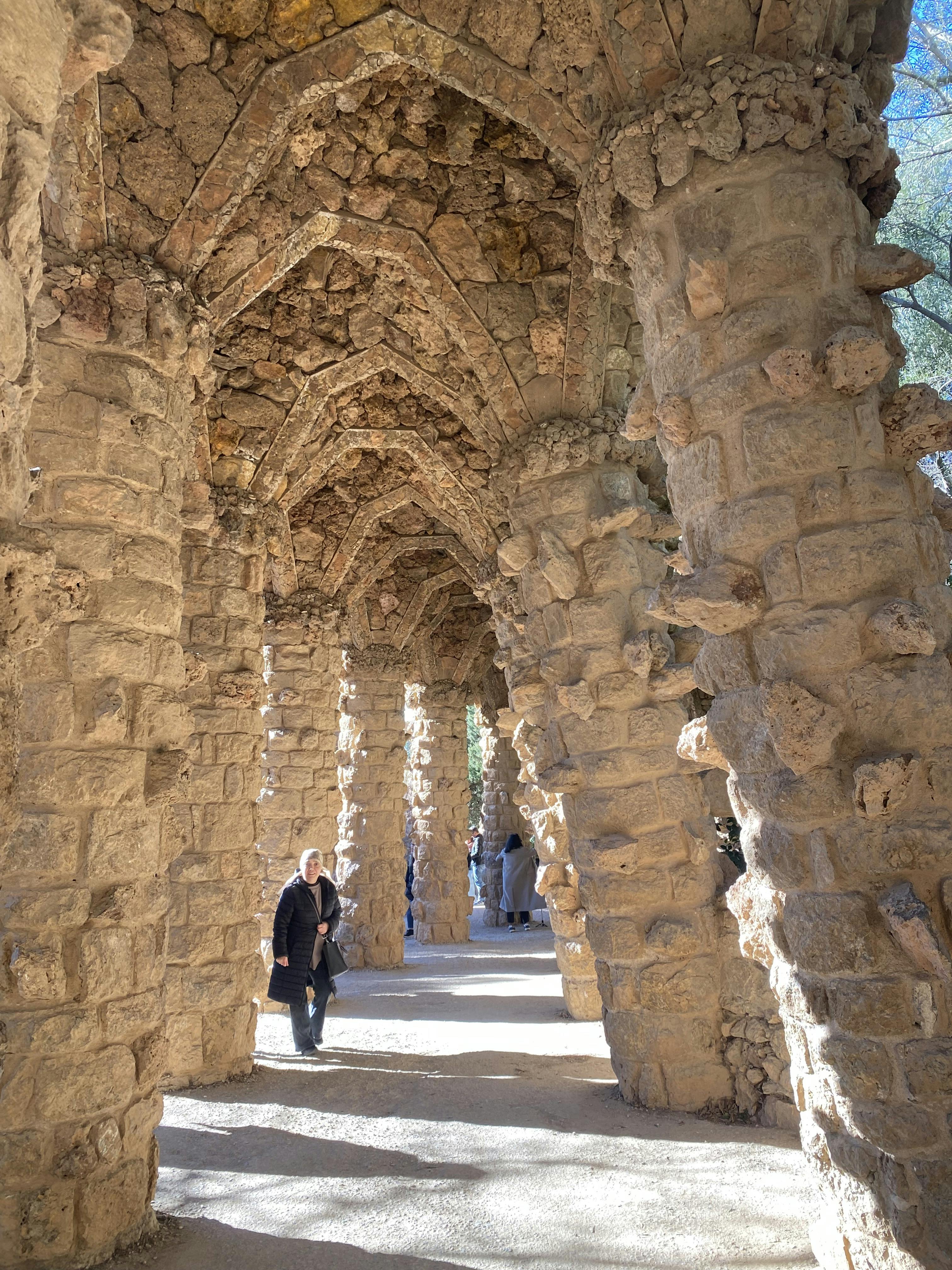 En dehors de la zone monumentale, vous pouvez passer plus de temps dans le grand parc public sans billet. Vous pouvez y suivre des chemins de terre sinueux à travers une forêt de pins méditerranéens et des broussailles basses. Les viaducs en pierre de Gaudí portent des passerelles au-dessus de vous, avec des piliers et des arcs rugueux qui se fondent dans le flanc de la colline. Vous pouvez marcher sous les viaducs ou sur leurs sommets en tant que chemins surélevés.
