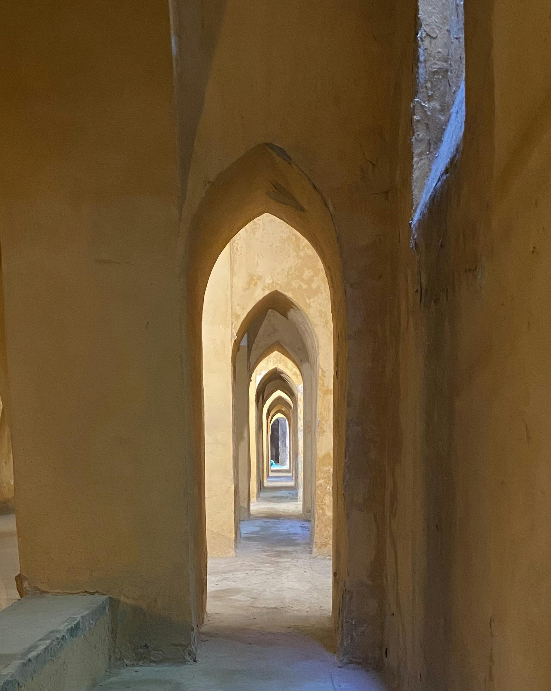 Une cour avec un bassin rectangulaire réfléchissant, entourée de colonnades ornées et voûtées et d'une végétation luxuriante.