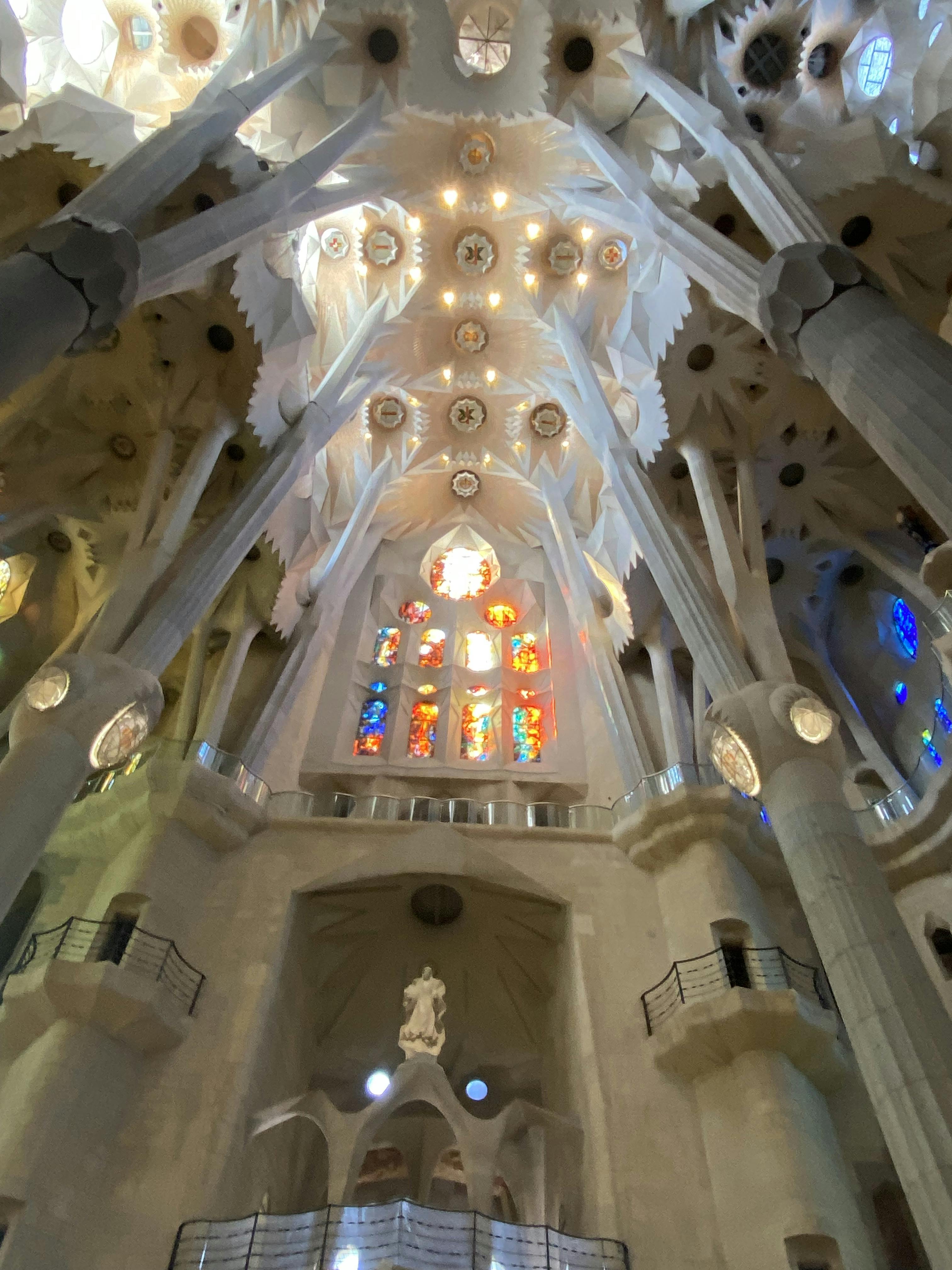 Plafond en forme de canopée : Au-dessus de la tête, les colonnes qui supportent le poids du plafond de la basilique se ramifient comme les arbres d'une gigantesque canopée, rappelant aux visiteurs l'échelle insondable de cette structure sacrée.
