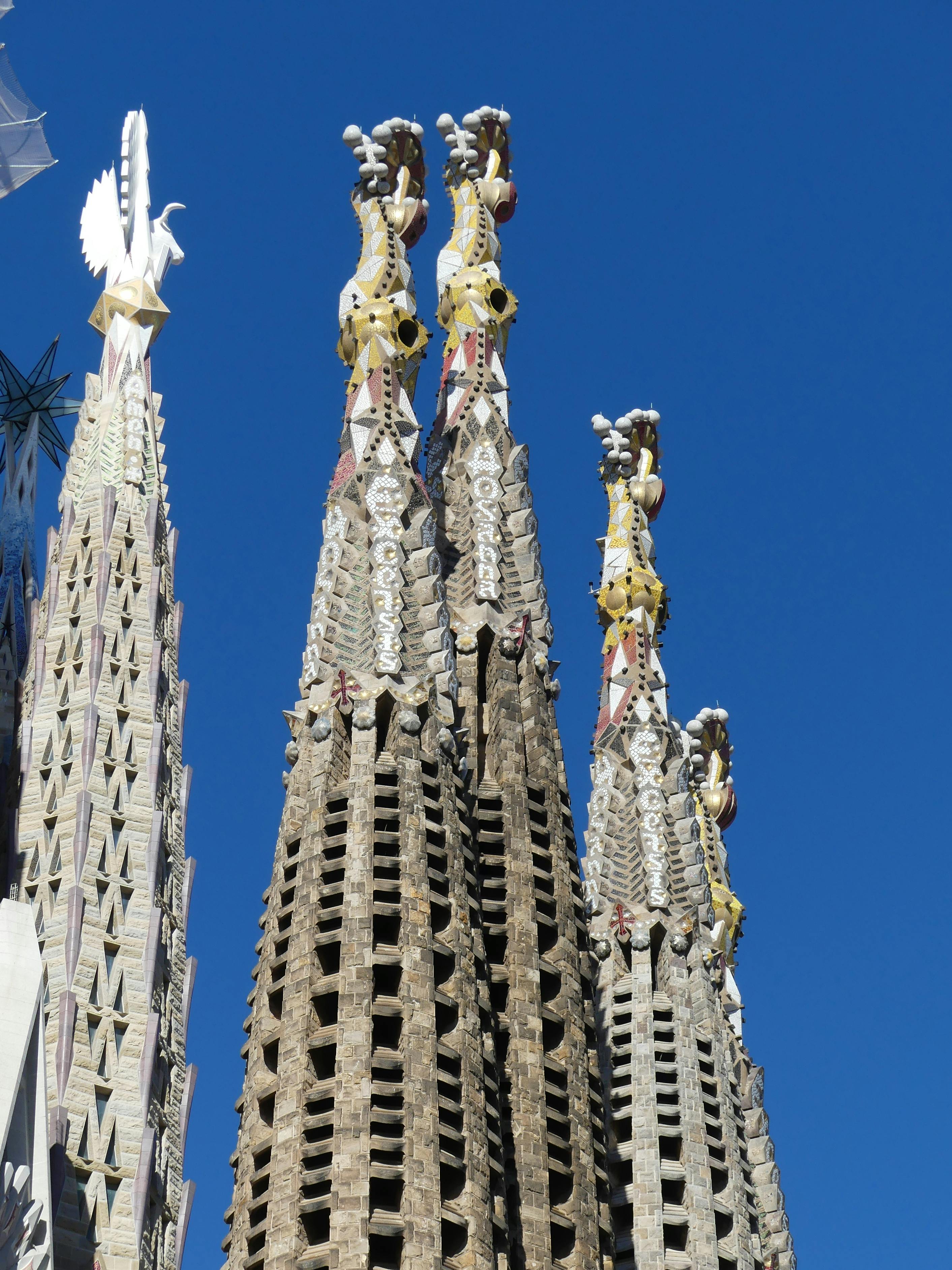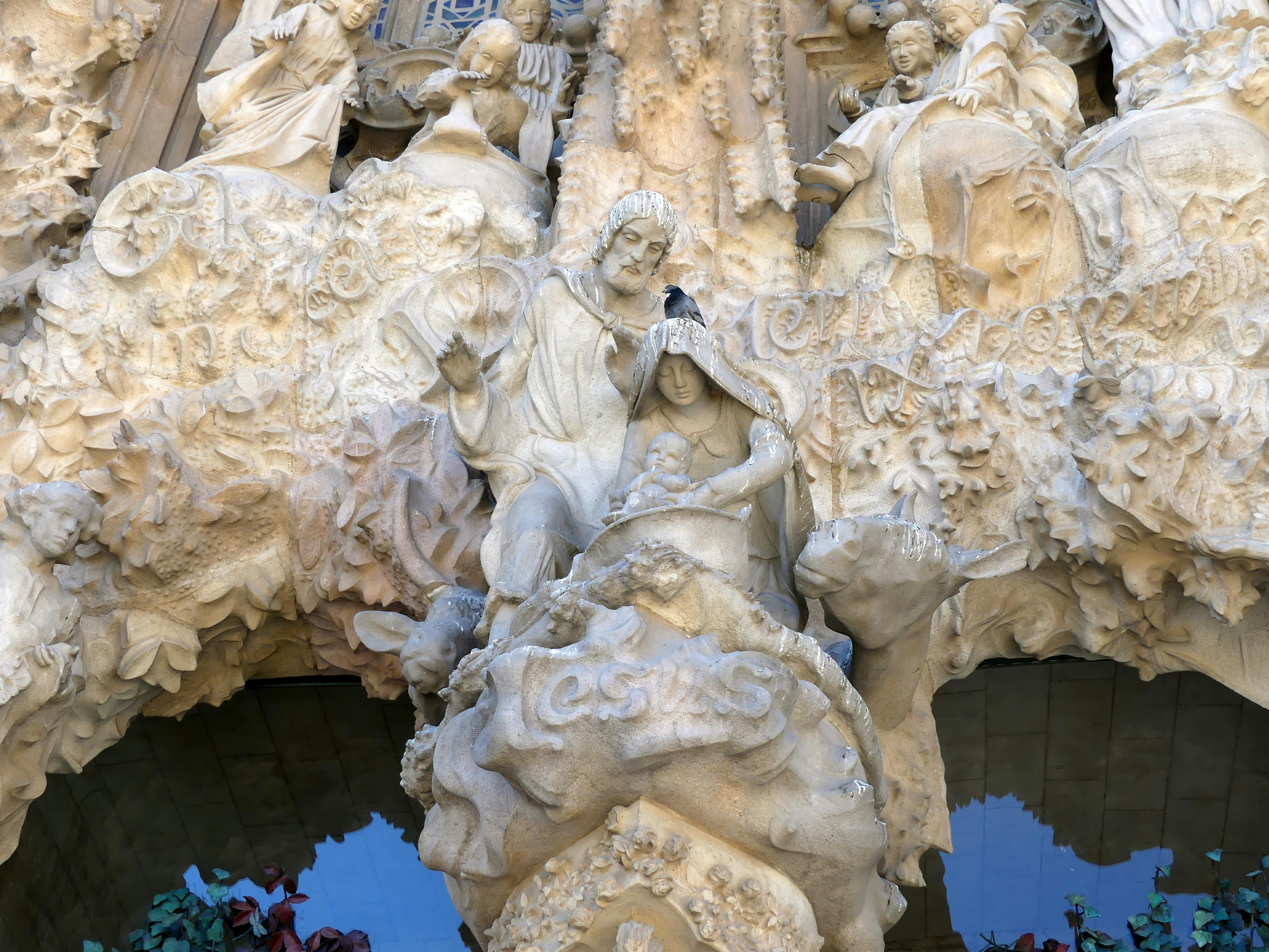 Façade de la Nativité : c'est la seule à avoir été achevée du vivant de Gaudí. Elle représente la naissance de Jésus par des sculptures joyeuses, ornées et inspirées de la nature.